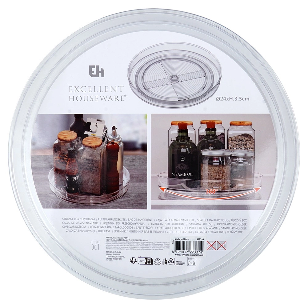 Organizator s premerom 24 cm in višino 3,5 cm je idealen za hladilnik, kuhinjske omare, delovni pult in kopalnico. Gladke površine se enostavno vzdržujejo – dovolj je, da jih obrišete z vlažno krpo. Vrtljiva konstrukcija hkrati maksimizira izrabo prostora in ohranja red.