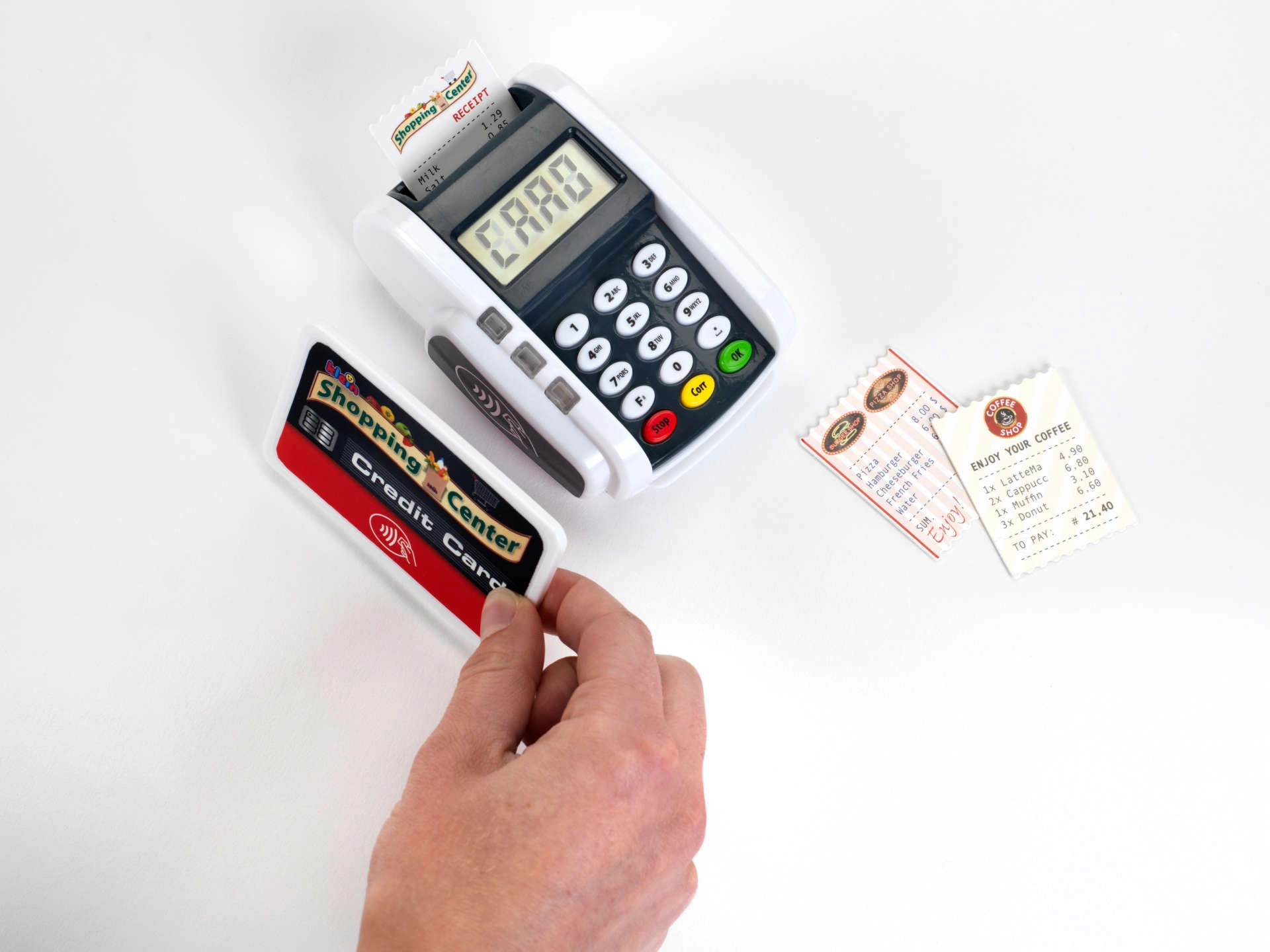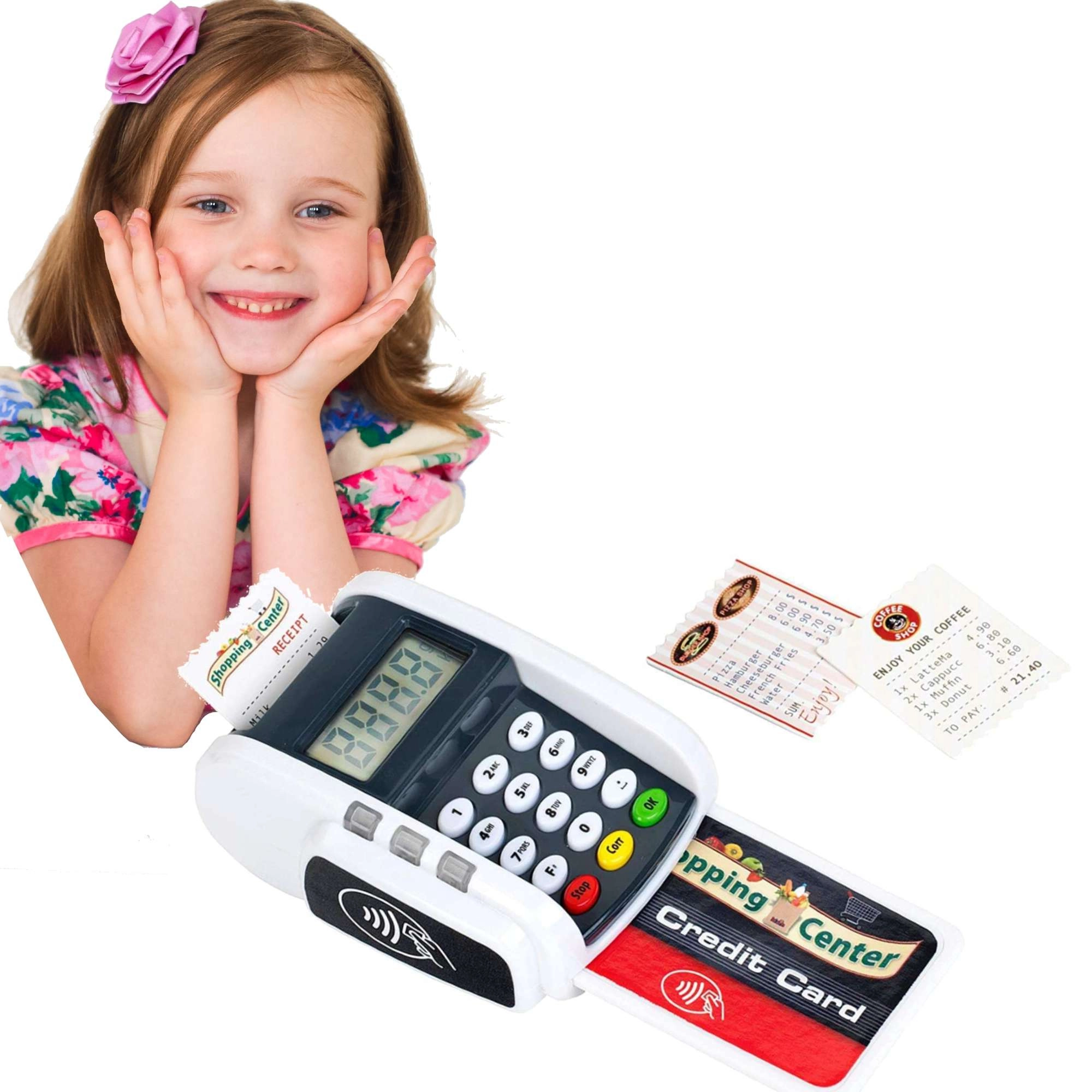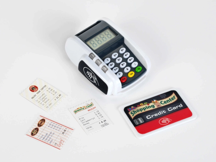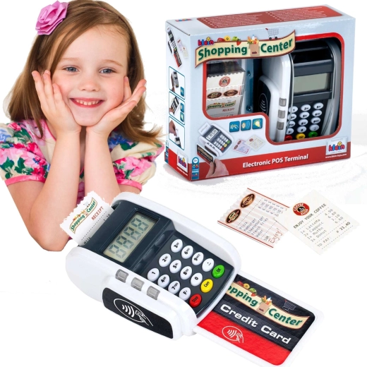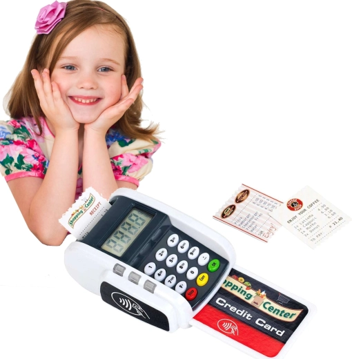 Ta kompaktni terminal zvesto posnema pravo napravo: otroci lahko pritiskajo številčno tipkovnico, prislonijo plačilno kartico in natisnejo »račune« za realistično igro blagajne. Svetlobni in zvočni učinki vsaki transakciji dodajo pravi pridih resničnosti in spodbujajo razvoj socialnih veščin.