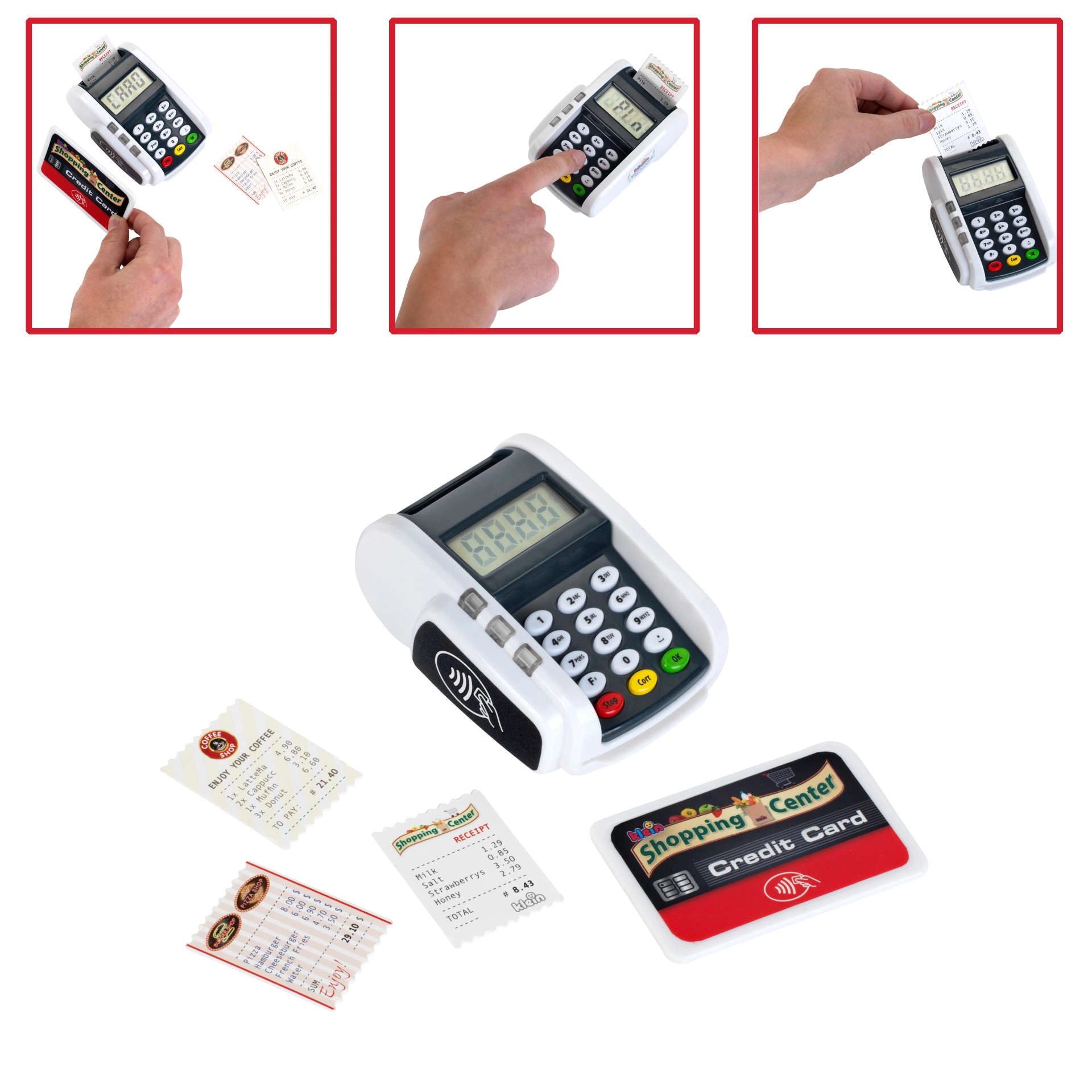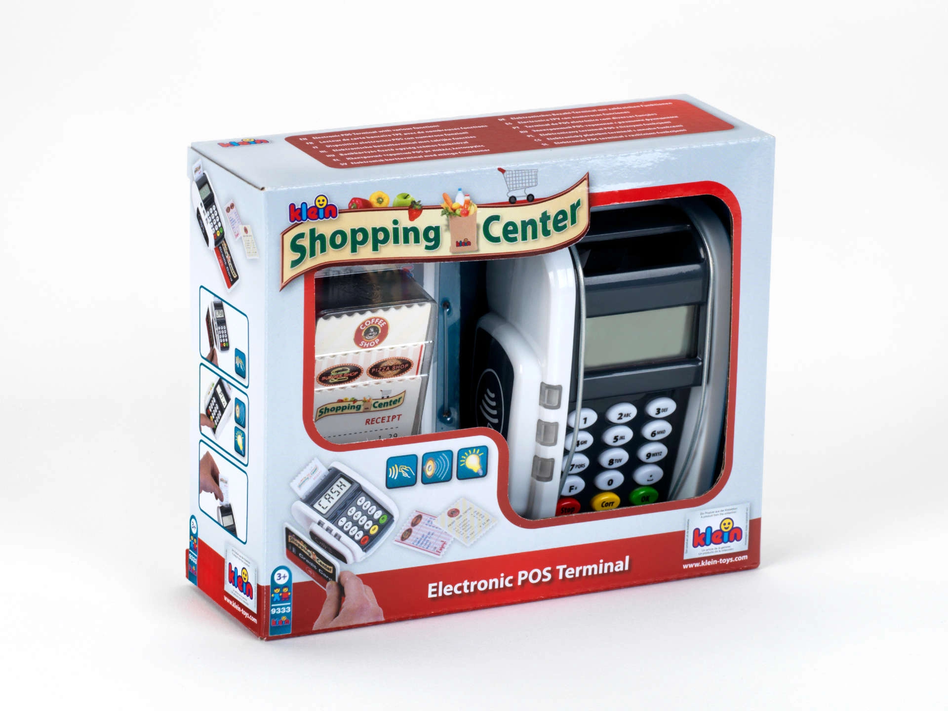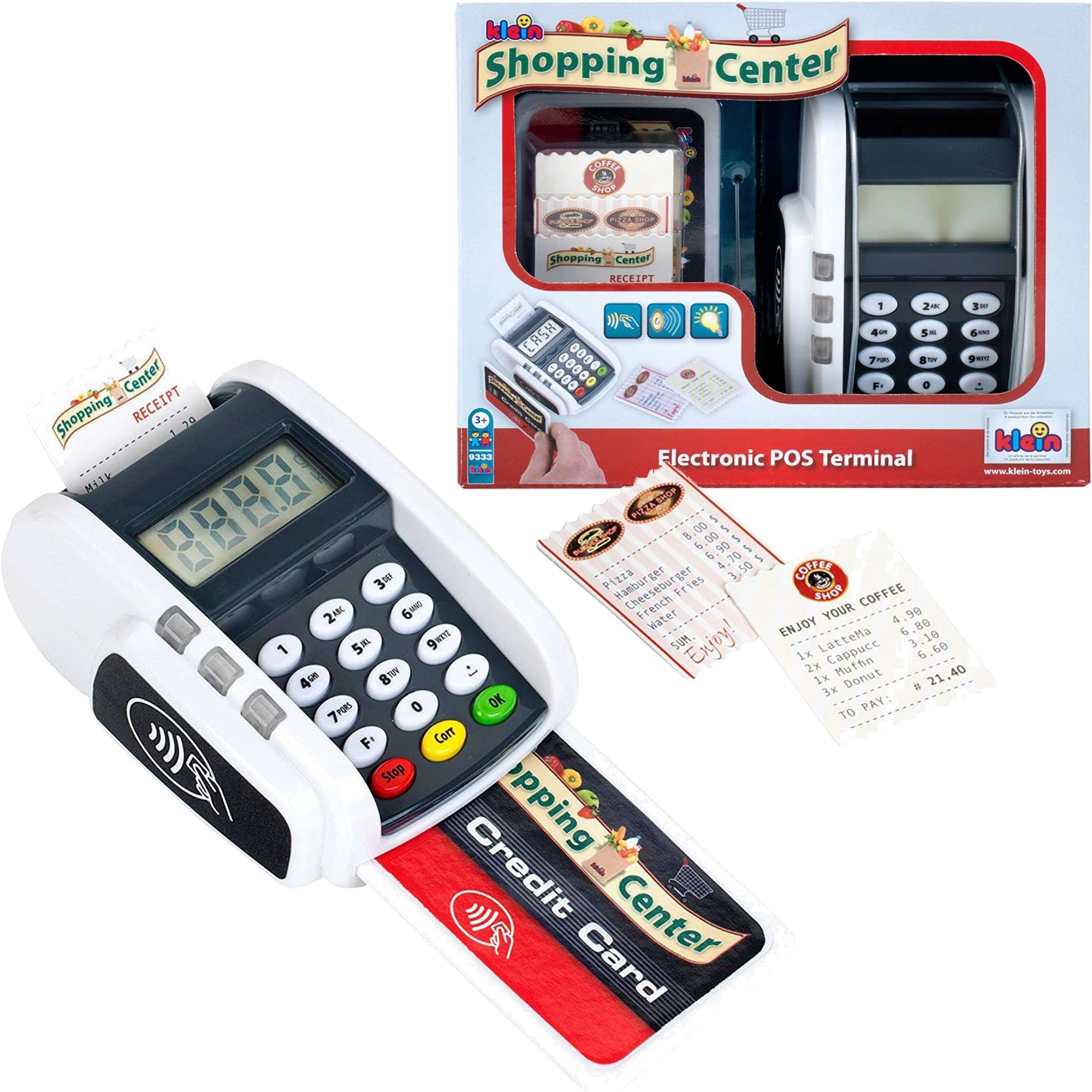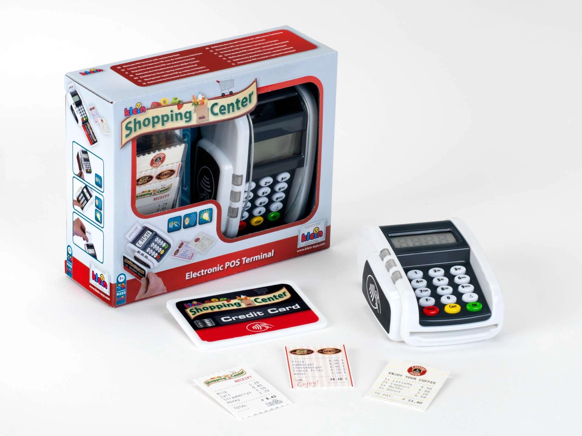 Realistični otroški plačilni terminal znamke KLEIN prinaša zabavo kot pri blagajni. Ponuja funkcionalne gumbe, čitalnik za brezstična plačila, svetlobne in zvočne učinke ter otrokom na igriv način omogoča razvijanje domišljije pri igri trgovine ali restavracije.