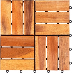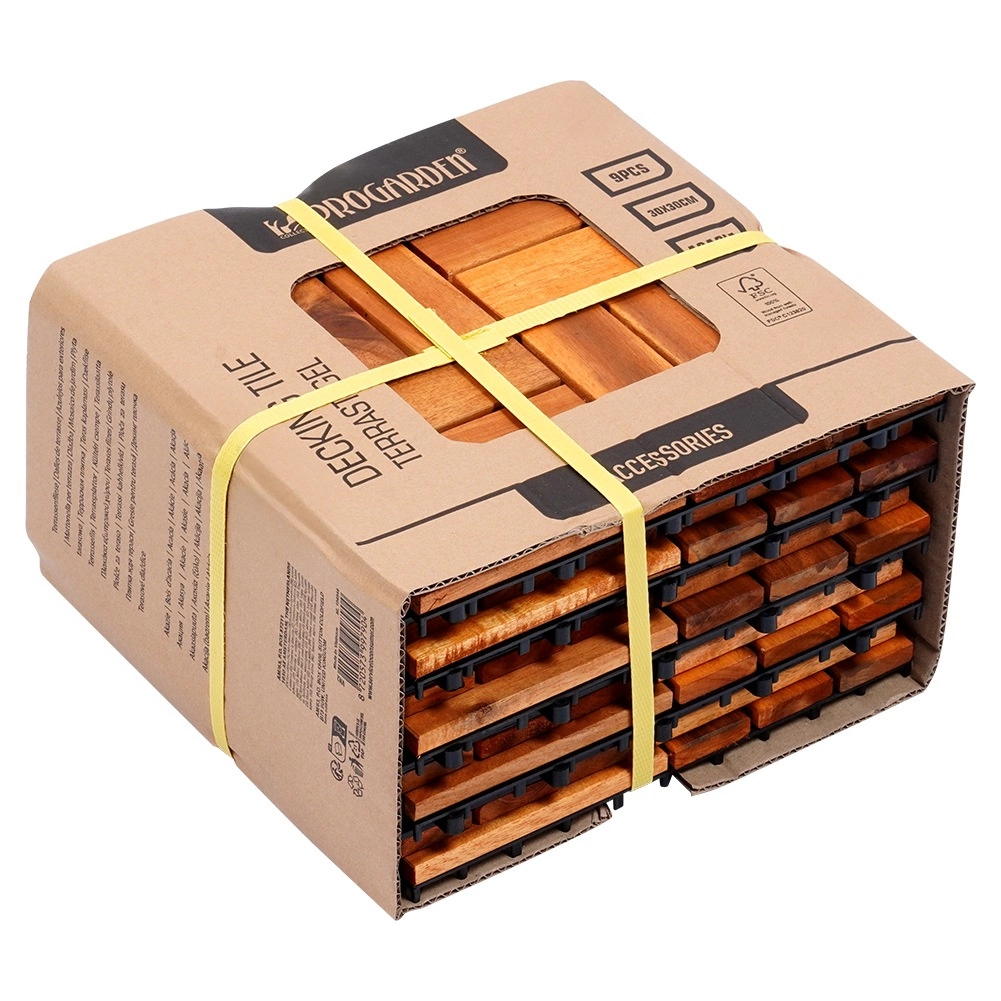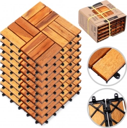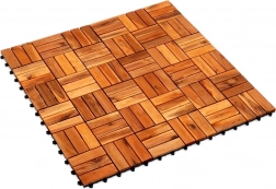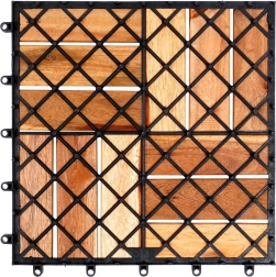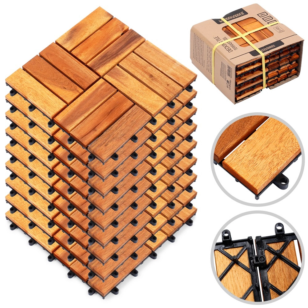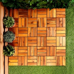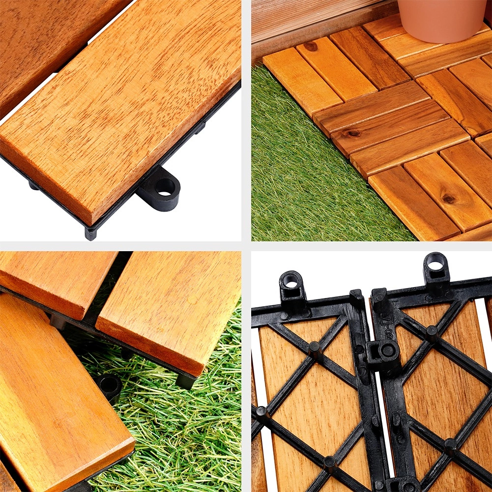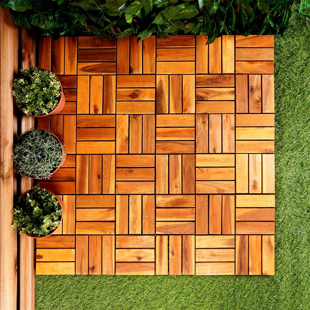 Te lesene terasne ploščice bodo vaš balkon, teraso ali vrtni kotiček spremenile v prijetno in stilsko območje. Površina iz kakovostnega akacijevega lesa v toplem rjavem odtenku prostoru doda naraven videz, medtem ko plastična mrežasta osnova skrbi za stabilnost, drenažo in prezračevanje.