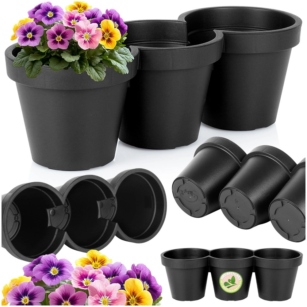 Ta praktičen trojni cvetličnik združuje tri okrogle posode (vsaka približno 14,5 cm) v en kompakten sklop dolžine 39,5 cm. Omogoča gojenje več vrst rastlin na enem mestu, hkrati pa ohranja enoten in čist videz zasaditve.