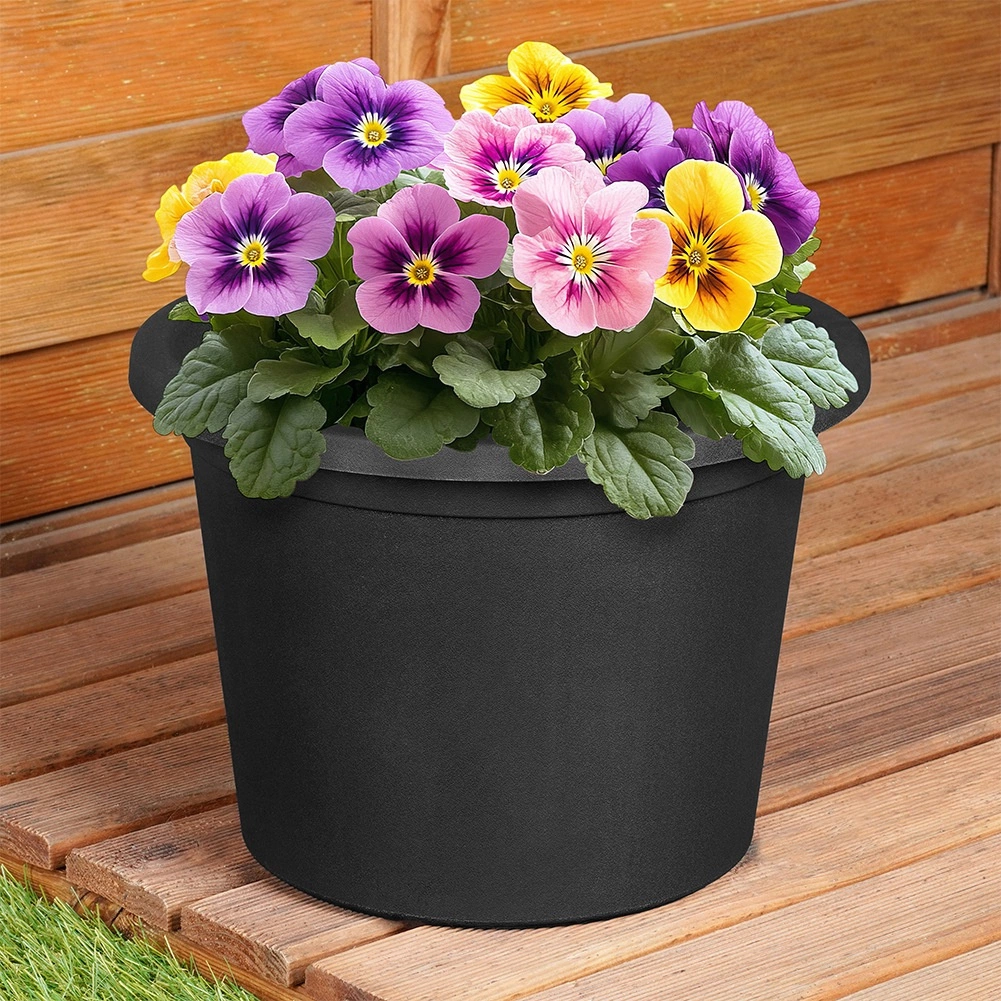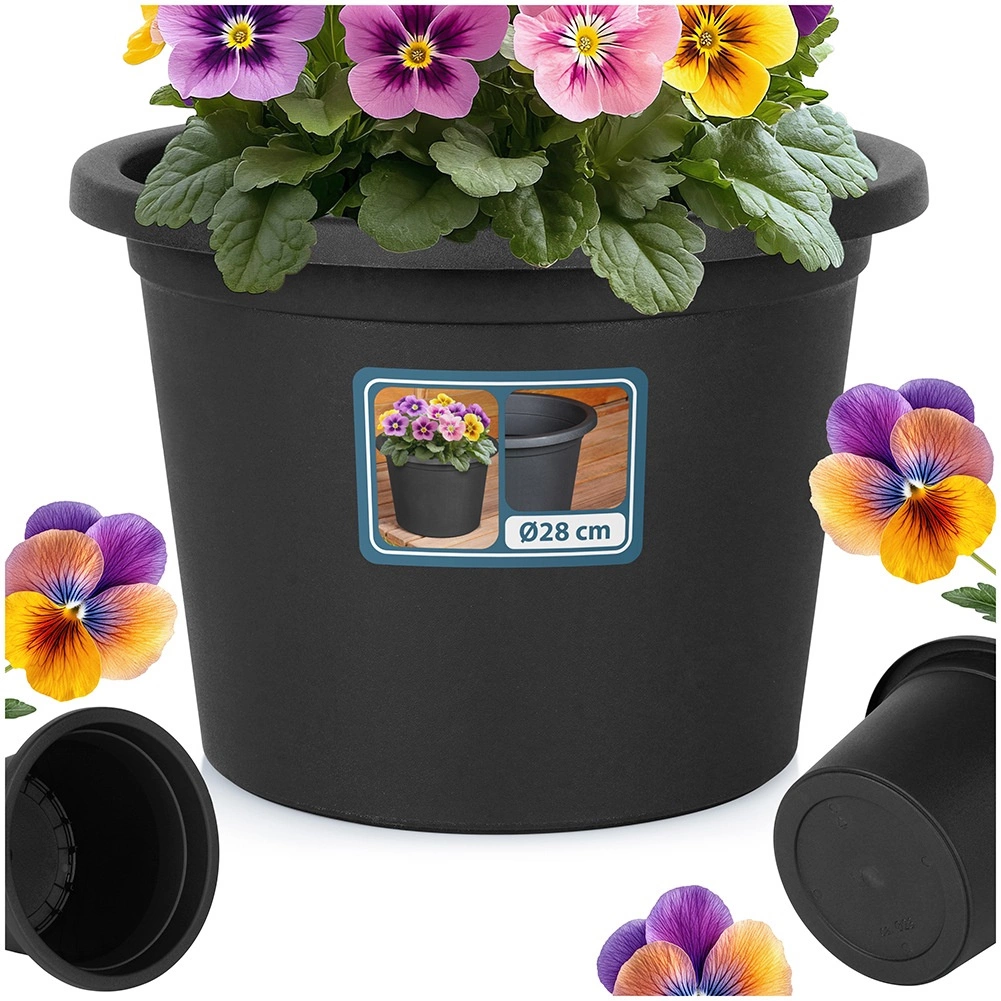 Črn okrogel cvetlični lonec s premerom 27,5 cm in višino 19,5 cm je idealna izbira za zunanjo uporabo skozi vse leto. Nudi dovolj prostora za rast rastlin in zaradi čvrstega roba ter zožujočih se strani deluje elegantno in stabilno. Primeren kot samostojen cvetlični lonec ali dekorativni ovijalni lonec za vložene posode.