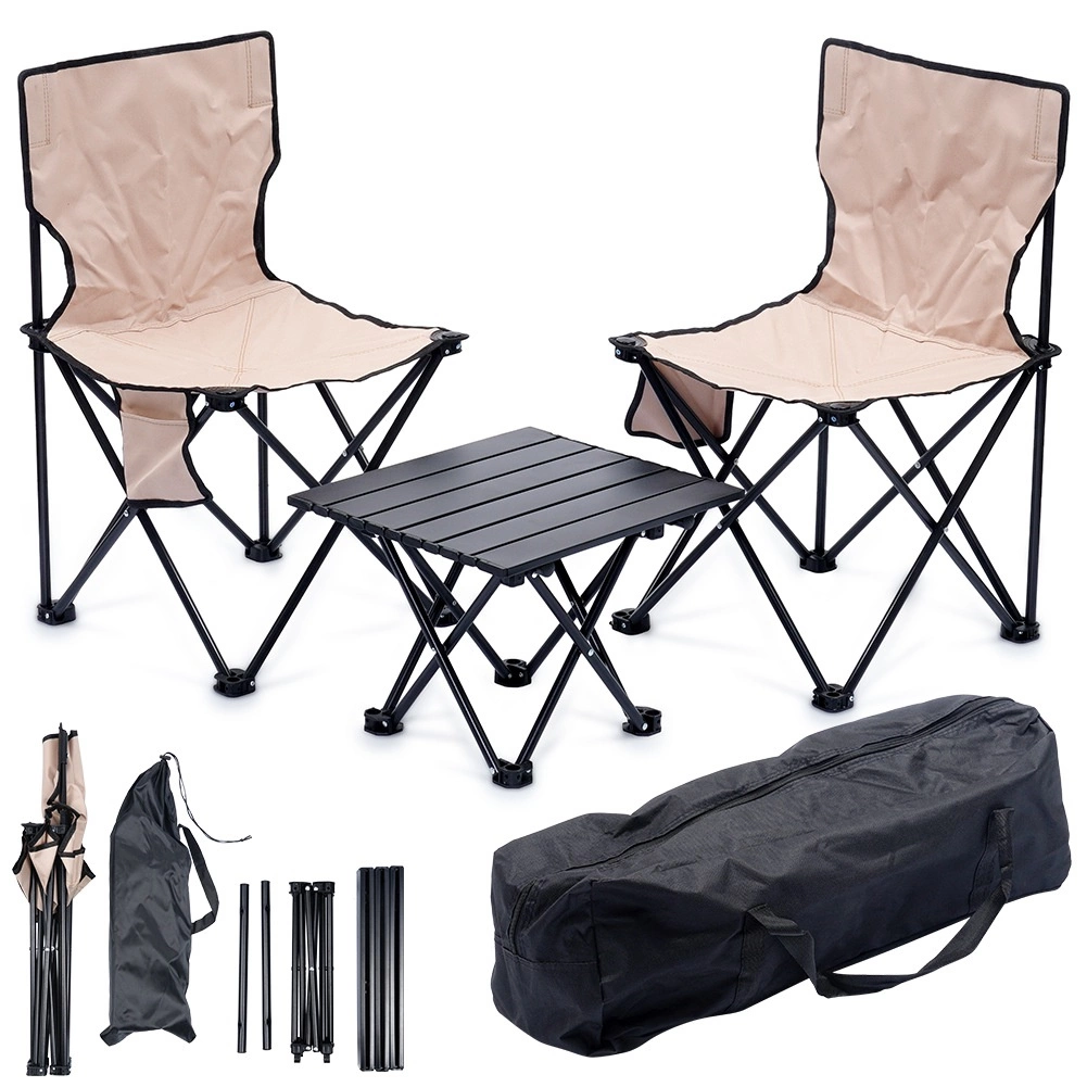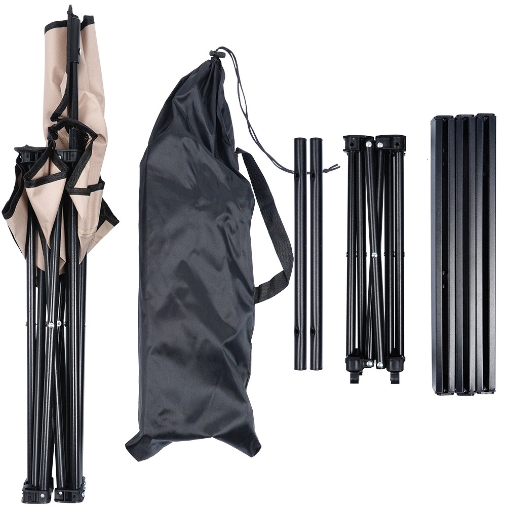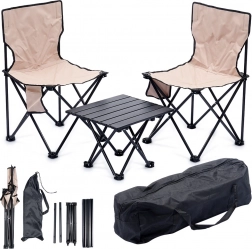 Poudarek na stabilnosti in trajnosti zagotavljata jeklen okvir v črni barvi in močna poliestrska tkanina v elegantnem bež odtenku. Zaradi kompaktnih mer je komplet popoln za kamp, piknik, ribiške izlete in sprostitev na vrtu.