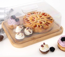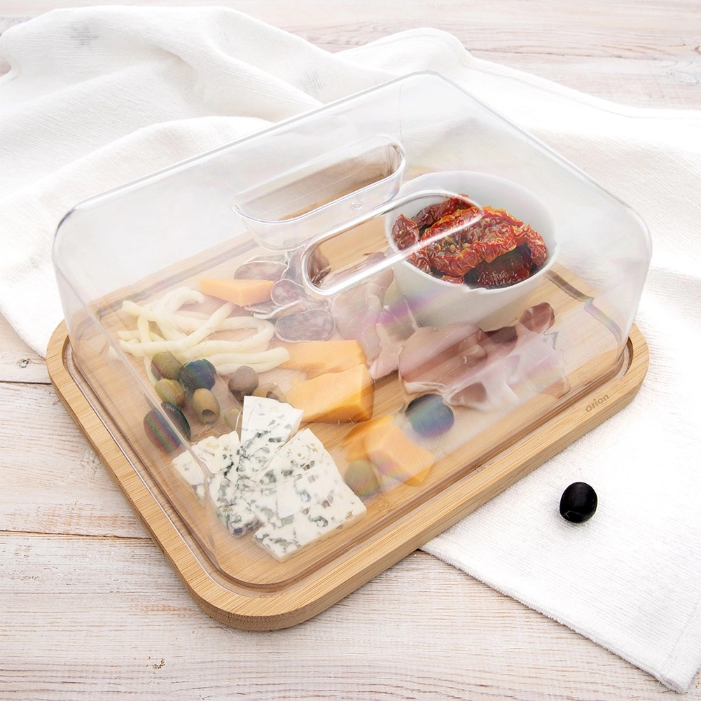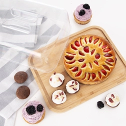 Ta pravokotna bambusova deska s prozornim pokrovom je zasnovana za vsakodnevno postrežbo in shranjevanje živil. Mere s pokrovom 28 × 22 × 11 cm nudijo dovolj prostora za sire, obložene kruhke, sladice ali sadje. Prozoren pokrov z vgrajenim ročajem omogoča hiter dostop in hkrati ohranja svežino postreženih dobrot.