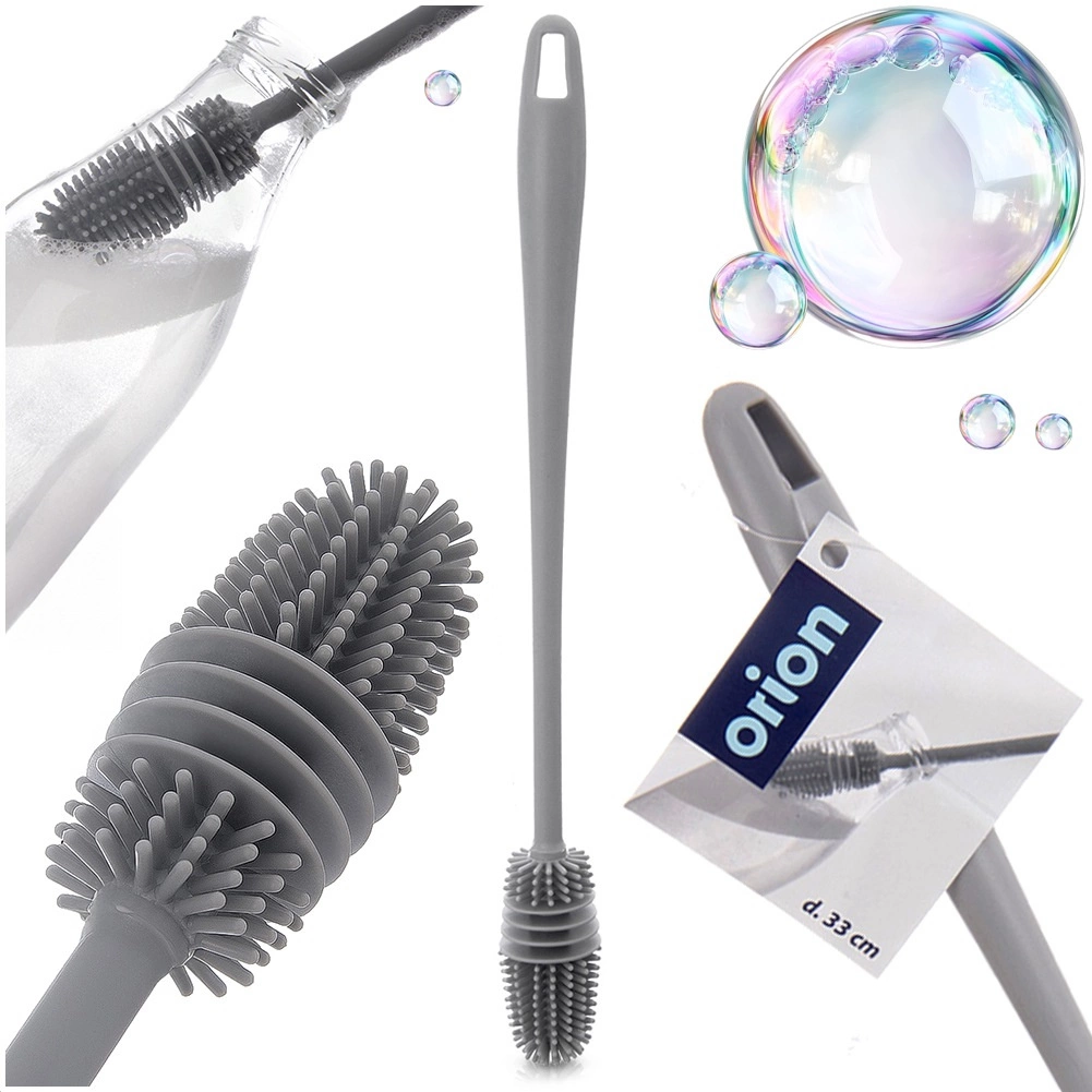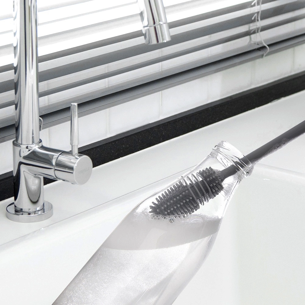 Praktična silikonska krtača za steklenice in ozke posode z dolžino 32,5 cm in glavo s premerom 3 cm. Zahvaljujoč dolgemu ročaju in gostim silikonskim ščetinam zlahka doseže težko dostopna mesta, učinkovito odstranjuje obloge in umazanijo ter je nežna do površin. Odporen, higienski silikon ne absorbira vonjav niti vlage, krtačo pa je mogoče pomivati v pomivalnem stroju.