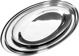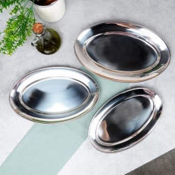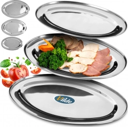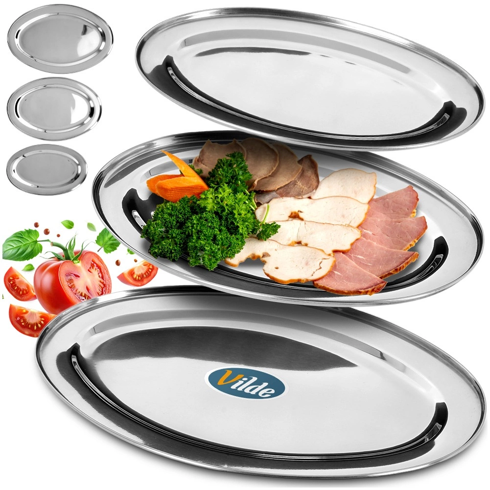 Set 3 ovalnih servirnih pladnjev iz kakovostnega nerjavnega jekla prinaša univerzalno rešitev za vsakodnevno in slavnostno serviranje. Sijoča površina doda vaši mizi eleganten videz, medtem ko dvignjen rob pomaga varno zadržati jedi in sokove na mestu.