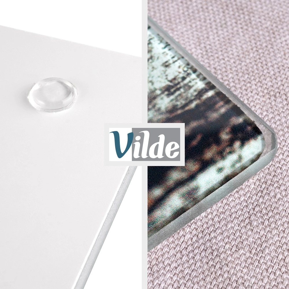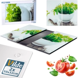 Elegantna seta dveh steklenih desk iz kaljenega stekla služi kot rezalni deski in pokrova kuhalne plošče, s čimer ustvarja dodatno delovno površino v majhni kuhinji. Ponuja odporno površino z dekorativnim motivom zelišč, nedrseče podloge za stabilnost, odpornost na toploto do 150 °C in preprosto čiščenje. Originalni izdelek znamke VILDE.