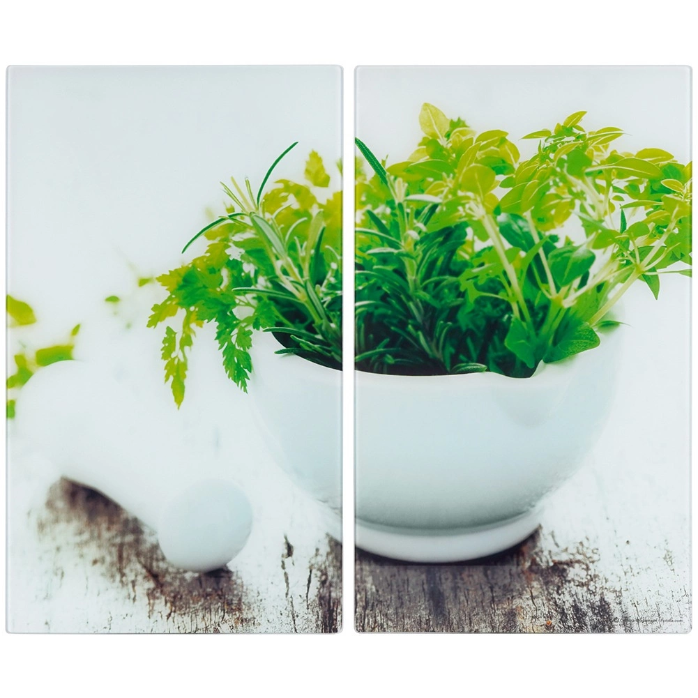 Praktična dvodelna seta iz zdravju neškodljivega kaljenega stekla razširi vašo delovno površino in hkrati zaščiti kuhalno ploščo pred poškodbami. Vsaka deska meri 52 × 30 × 0,4 cm, skupaj ustvarita delovni prostor približno 60 × 52 cm. Sijajna površina z motivom svežih zelišč doda kuhinji stil in je neporozna – ne absorbira vonjav niti tekočin.