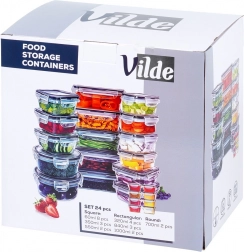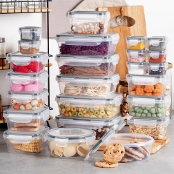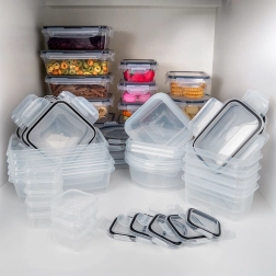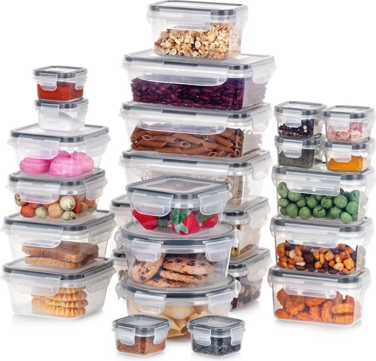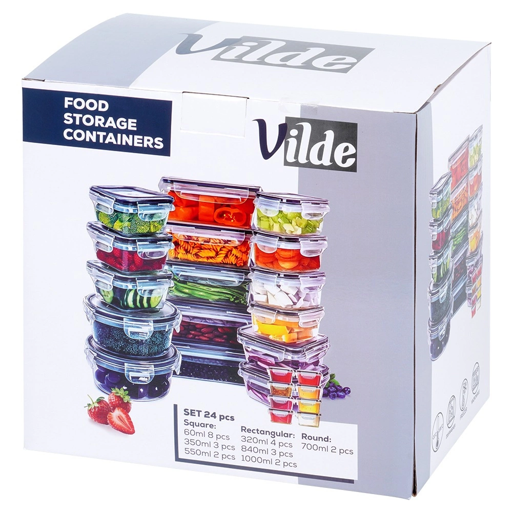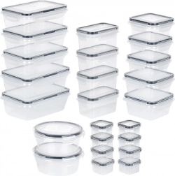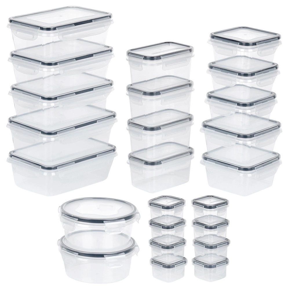 Ta vsestranski set 24 posod v sedmih velikostih vam pomaga ohranjati red v shrambi in hladilniku. Od majhnih posodic za začimbe in omake do večjih posod za testenine, žitarice ali pripravljena kosila – vsebina bo vedno na očeh zahvaljujoč prozornemu plastiku in varno zaprta z tesnim pokrovom s 4 sponkami.