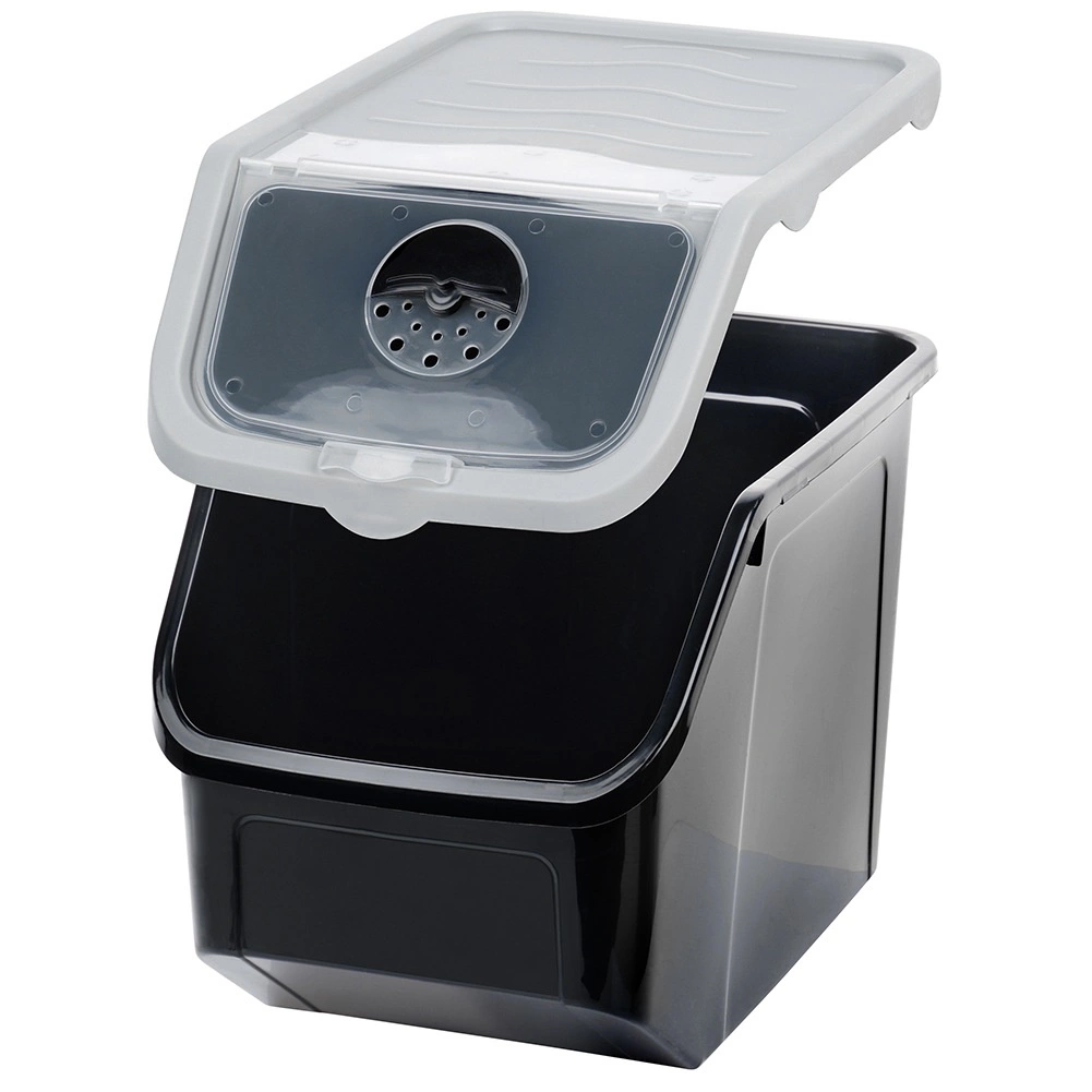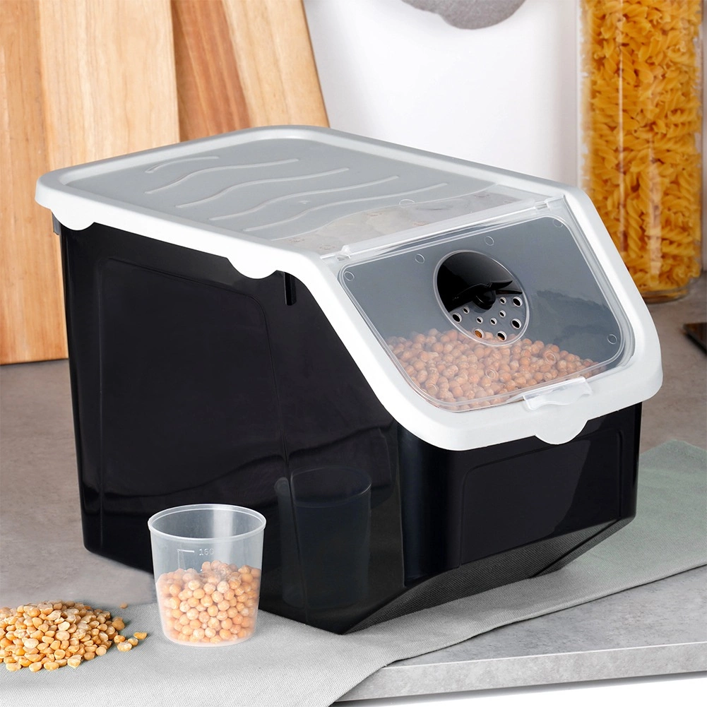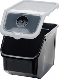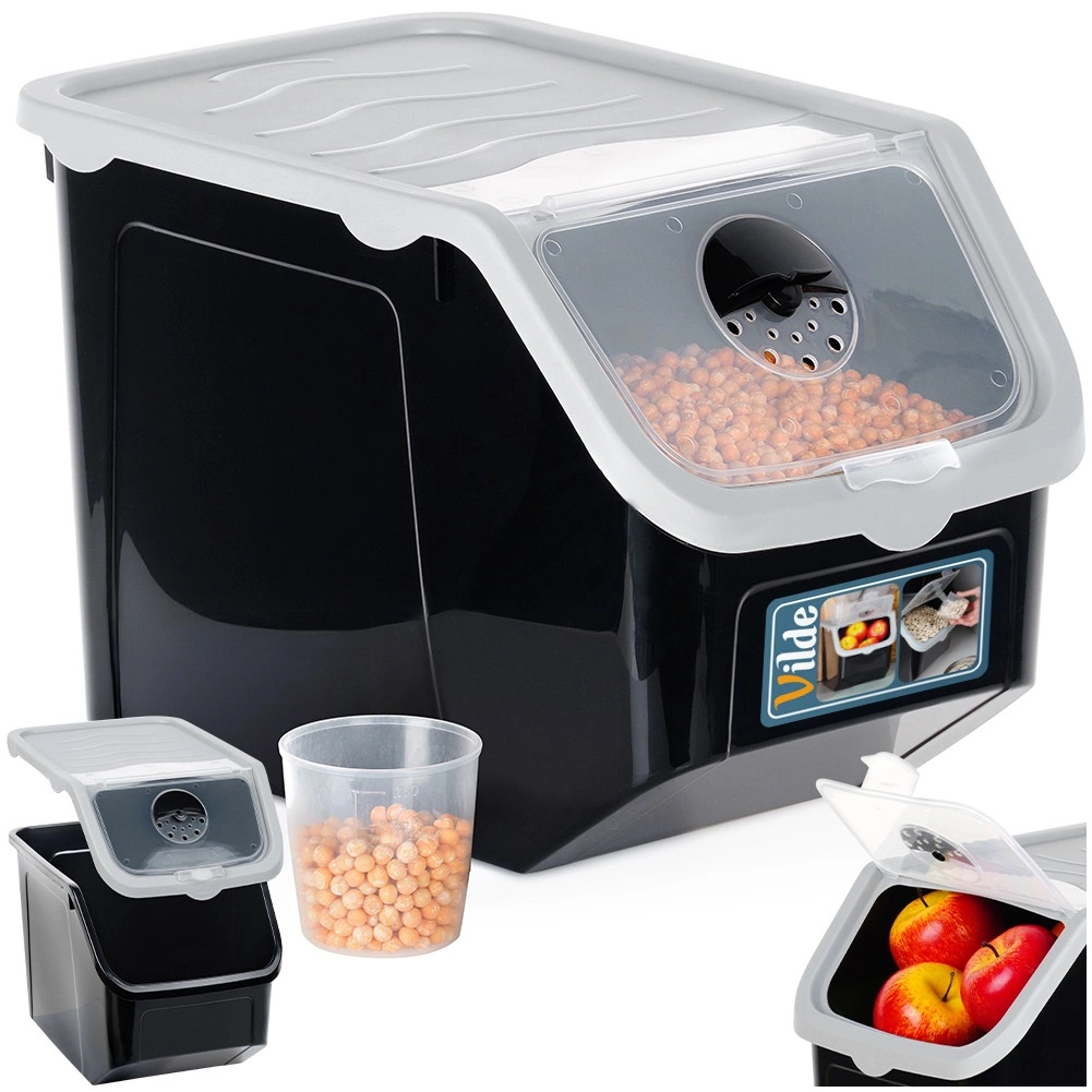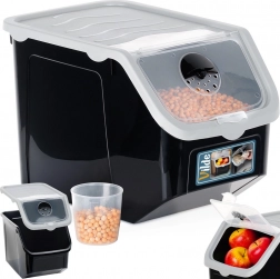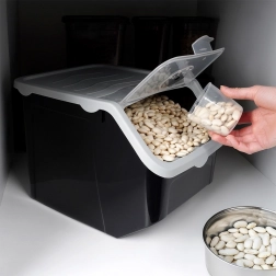 Škatla je iz kakovostne plastike v črni barvi s sivim pokrovom, je primerna za stik z živili, prenese temperature od -20 °C do 100 °C, lahko jo postavite v zamrzovalnik in pomivalni stroj. Odlična je tudi za stročnice, riž, testenine, hrano za hišne ljubljenčke ali pralna sredstva. Priložena je praktična merica za natančno doziranje.