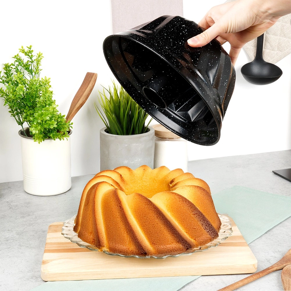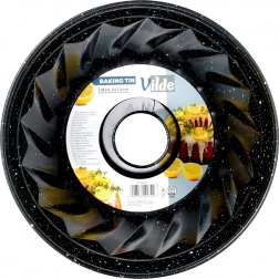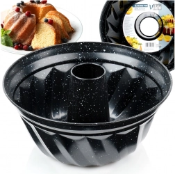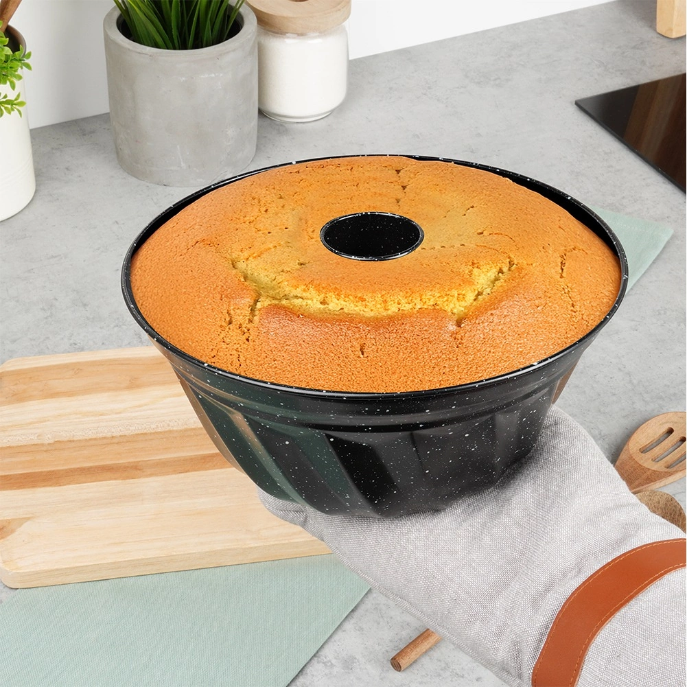 Ta model za šarkelj s kominom je zanesljiva izbira za vsakodnevno peko in praznične sladice. Zahvaljujoč granitnemu nelepljivemu premazu se testo ne prijema, šarkelj pa zlahka odstranite brez poškodb dekorativnih reber. Masivno ogljično jeklo učinkovito vodi toploto in podpira enakomerno prepečenost sredine in robov.