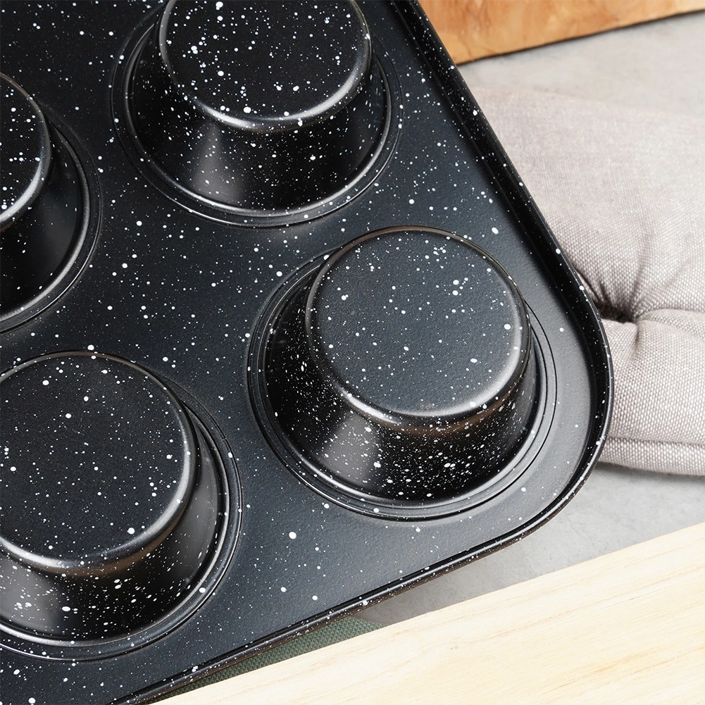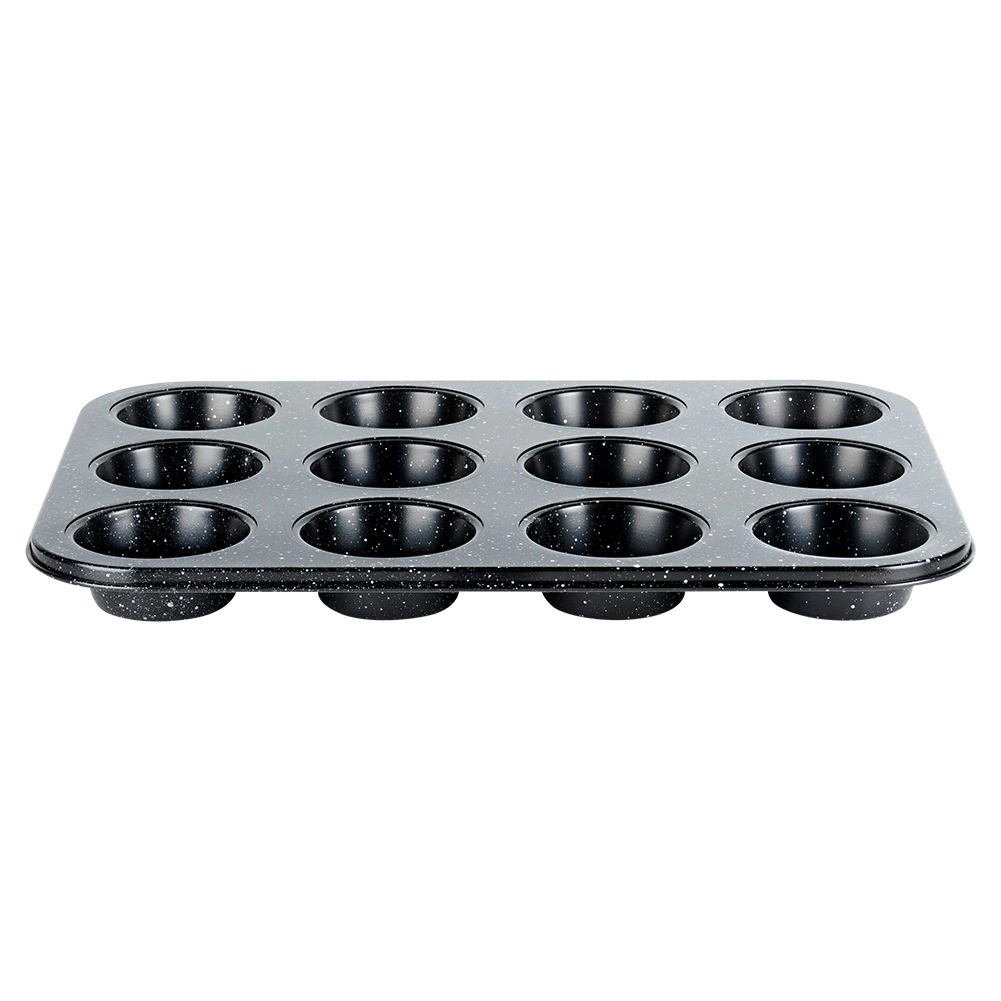 Ta kakovosten pekač za mafine iz obstojnega ogljičnega jekla z granitno neprijemljivo prevleko je idealen za pripravo sladkih in slanih dobrot. Naenkrat speče do 12 popolnih porcij, odlično prevaja toploto ter pomaga doseči enakomerno pečeno sredico in hrustljav rob.