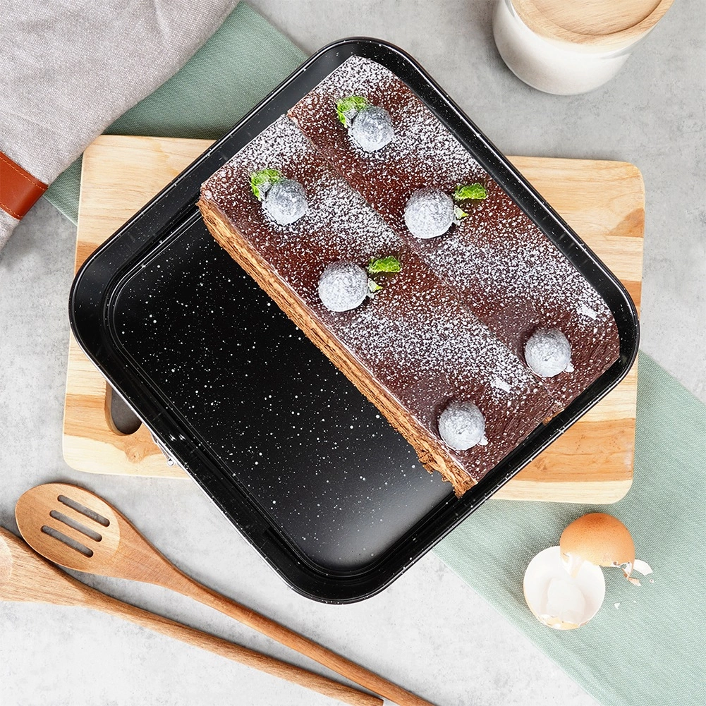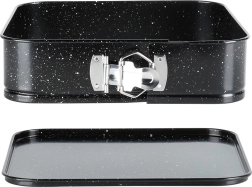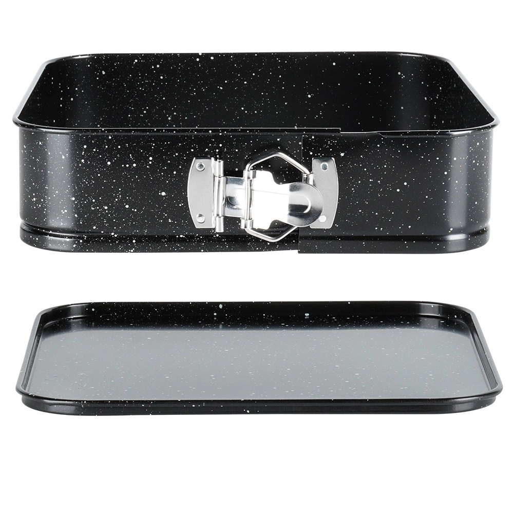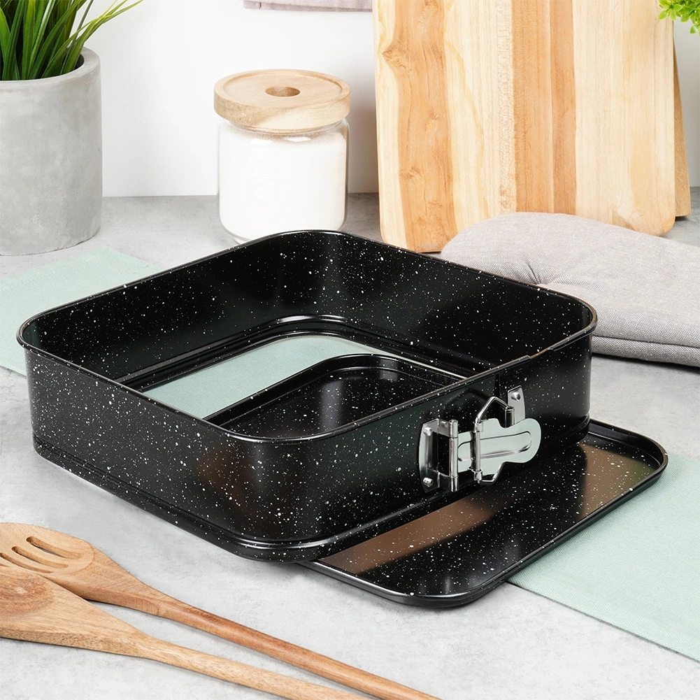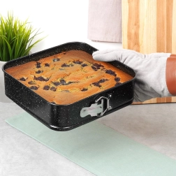 Praktičen kvadraten pekač z raztegljivim obodom in odstranljivim dnom za enostavno jemanje sladic iz modela. Izdelan iz trpežnega ogljičnega jekla z neprijemljivo granitno prevleko za enakomerno pečenje do 230 °C. Idealen za cheesecake, torte, biskvite in pečene jedi.