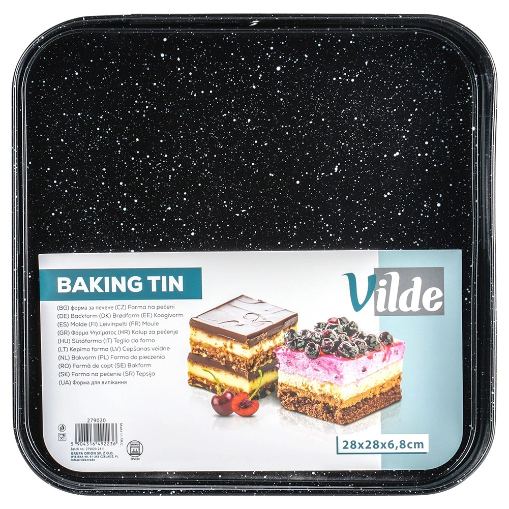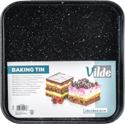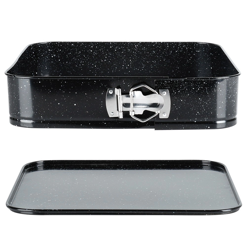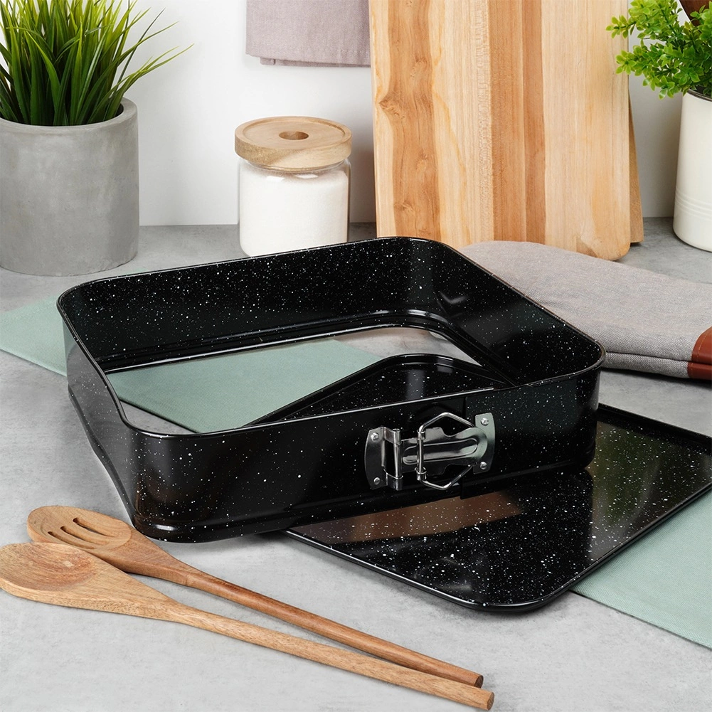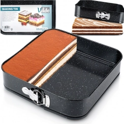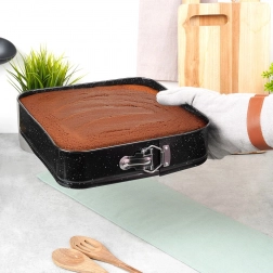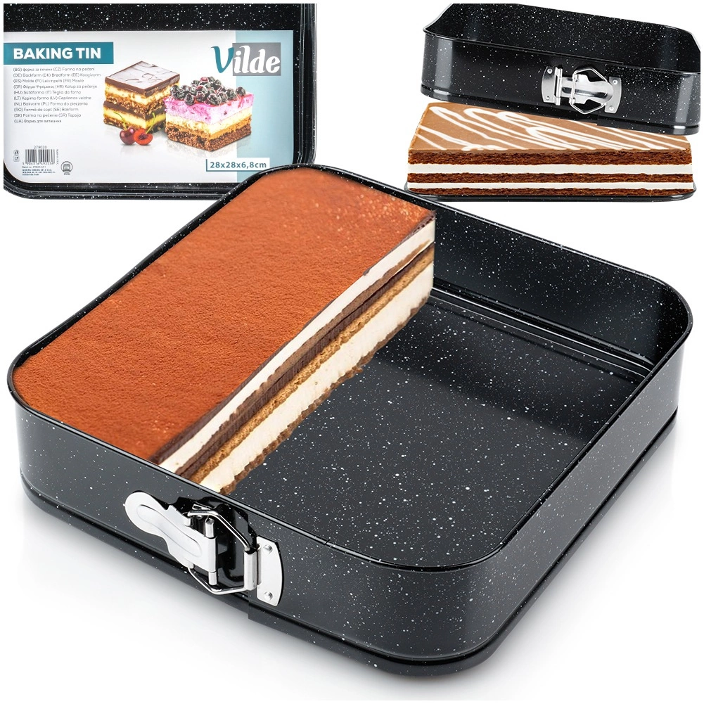 Ta kvadraten raztegljiv pekač 28 × 28 × 6,8 cm je odlična izbira za vsakodnevno peko. Ohišje iz kakovostnega ogljičnega jekla z granitnim površinskim slojem zagotavlja odličen prenos toplote in zmanjšuje prijemanje. Pekač preprosto odprete s stransko sponko, z odstranljivim dnom pa zlahka odstranite pečen biskvit brez poškodovanja oblike.