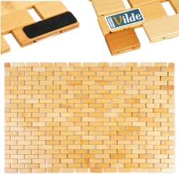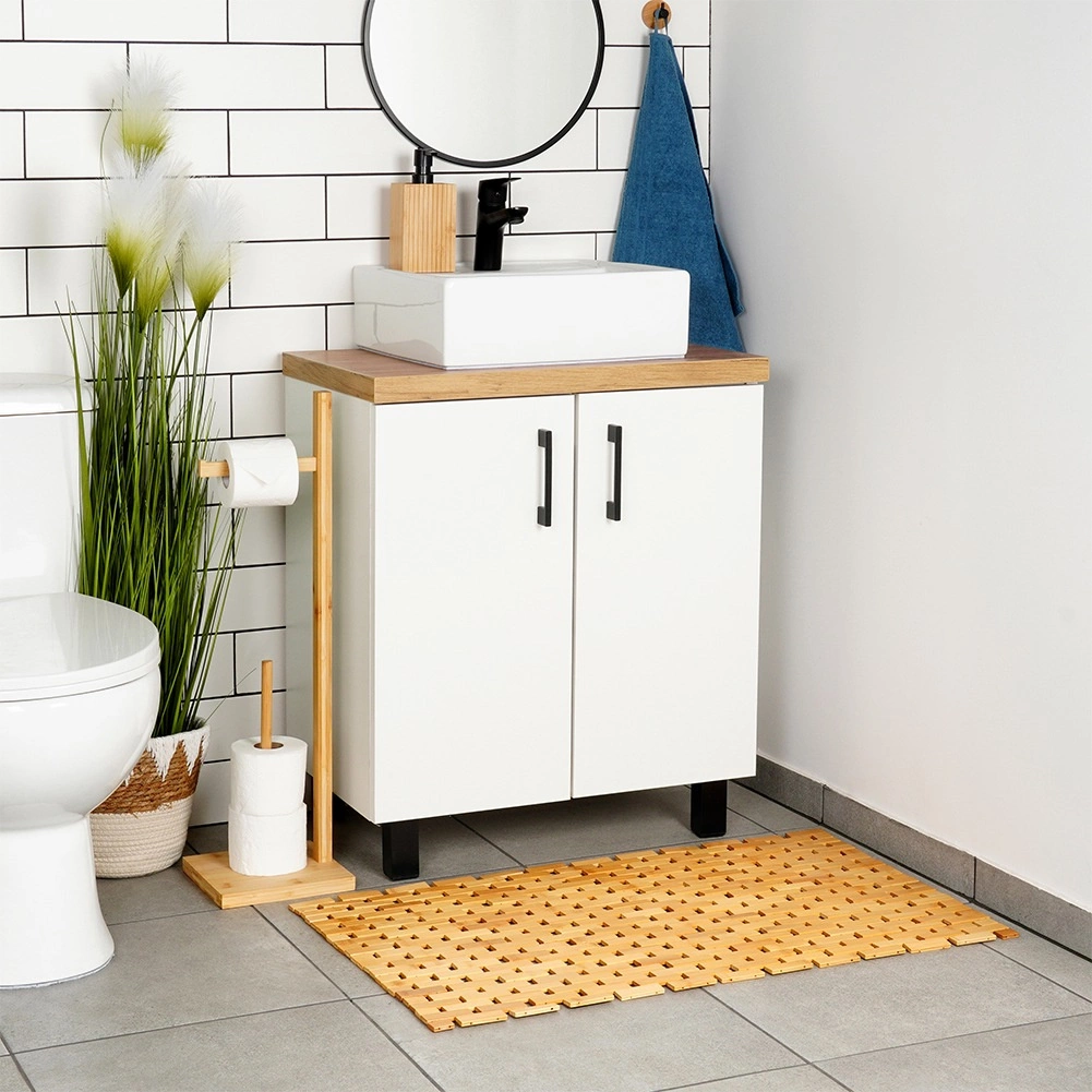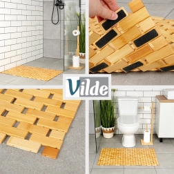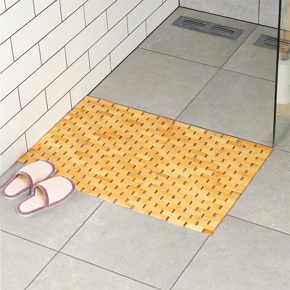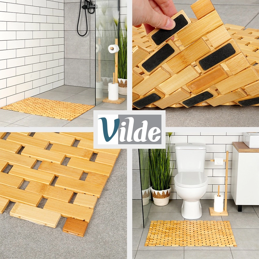 Ta stilska bambusova kopalniška preproga združuje naraven videz s praktičnimi lastnostmi. Bambusove letvice z zračnimi režami pospešujejo odtekanje vode in sušenje, zato površina ostaja higienska in prijetna na dotik. Zaradi brezčasnega dizajna se lepo poda tako k modernim kot klasičnim kopalnicam.