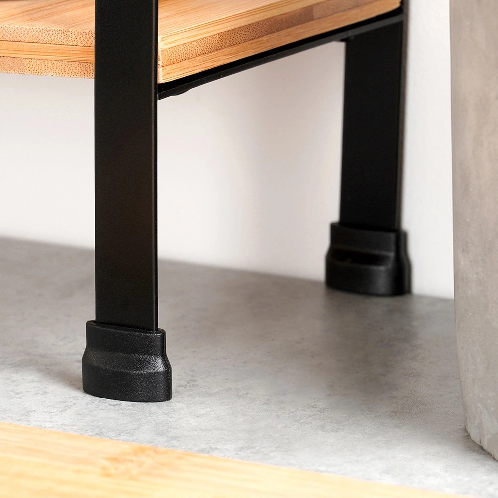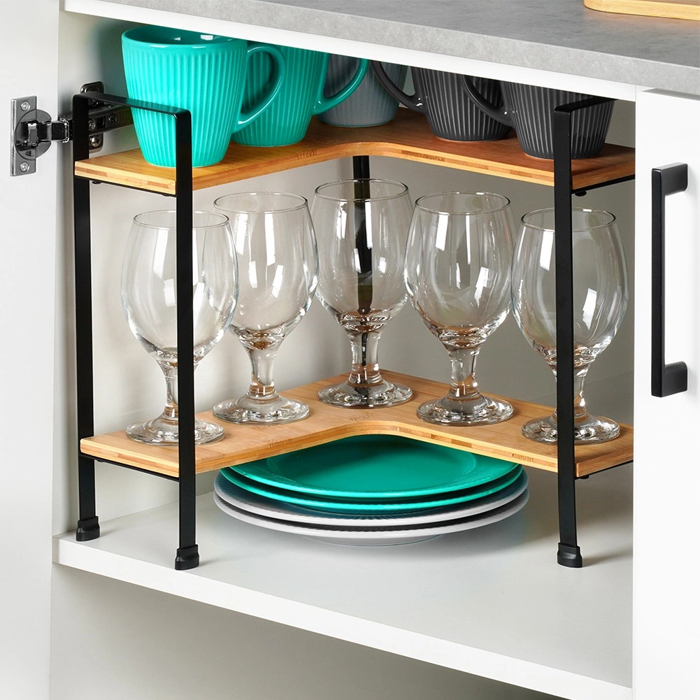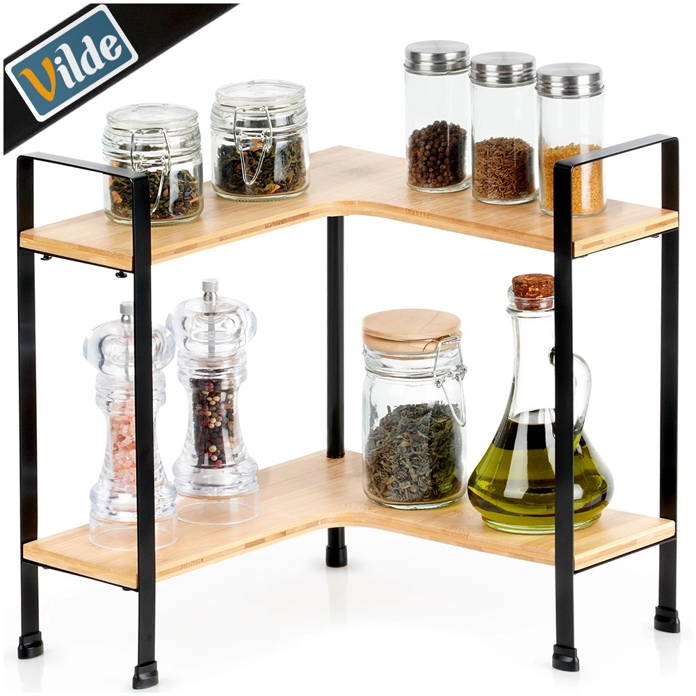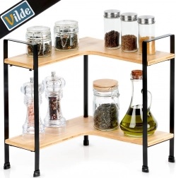 Elegantna in praktična kotna polica pomaga maksimalno izkoristiti prostor na kuhinjskem pultu in v notranjosti omaric. L‑oblikovana konstrukcija se natančno prilega kotu, dve ravni pa omogočata pregledno shranjevanje začimb, kozarcev in manjših dodatkov. Kombinacija naravnega bambusa in črne kovine doda kuhinji moderen videz.