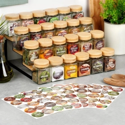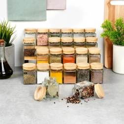 Komplet steklenih posodic za začimbe je idealen za vsakodnevno kuhanje in urejeno shranjevanje. Vsaka posodica ima prostornino 100 ml, prozorno telo za lahek pregled vsebine ter pokrovček iz bambusovega lesa, ki doda naraven videz in zagotavlja praktično zapiranje. Z vključenimi nalepkami z imeni najpogostejših zelišč in začimb boste pravo sestavino našli v hipu.