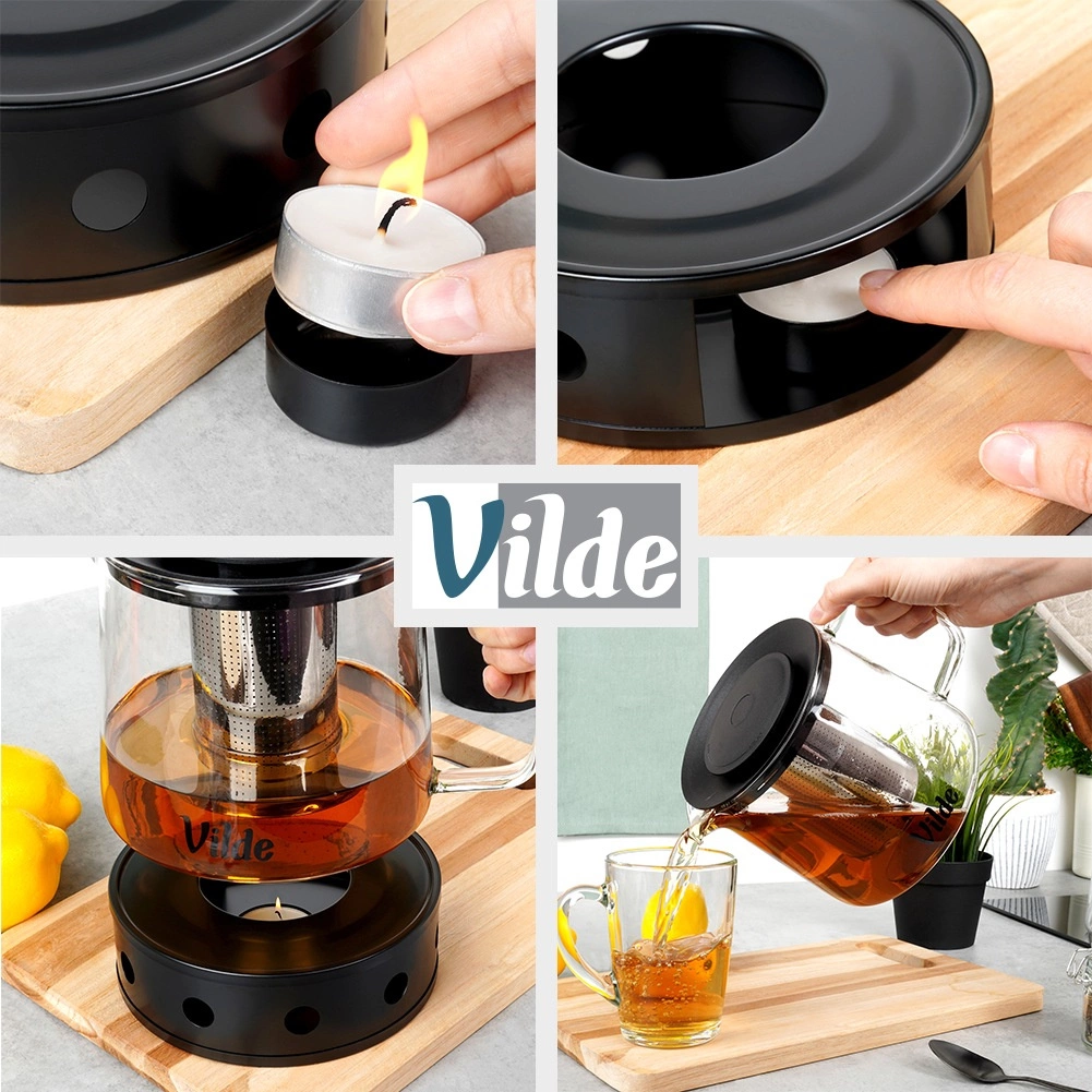 Eleganten stekleni čajnik s prostornino 1,5 l in vgrajenim nerjavnim sitkom omogoča pripravo čistega napitka brez lističev. Zahvaljujoč priloženemu grelniku na čajno svečko pijača ostane dlje topla. Toplotno odporno borosilikatno steklo, praktičen odstranljiv pokrov in udobno točenje brez kapljanja naredijo ta čajnik odlično izbiro za čaj, zeliščne poparke in hladne limonade. Originalni izdelek VILDE.