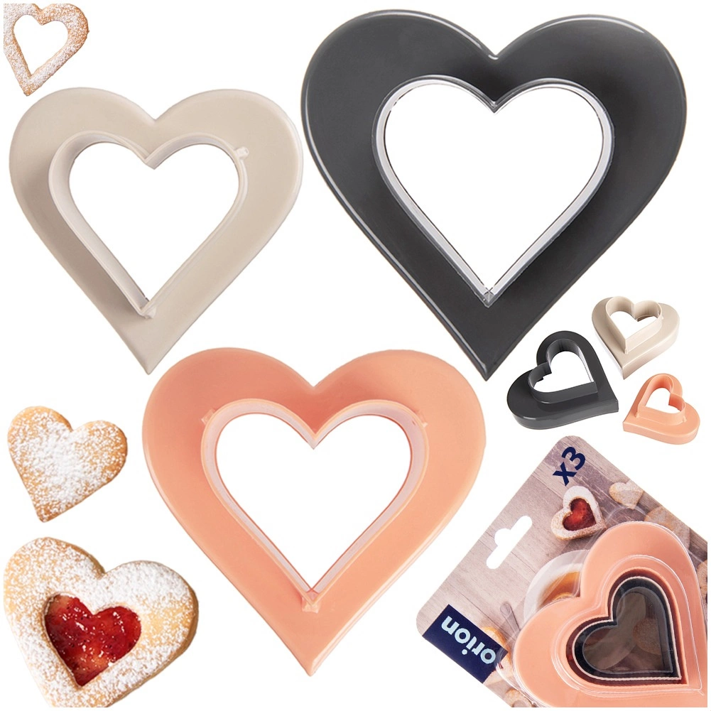 Odkrijte kreativno peko s kompletom 3 dvostranskih modelčkov v obliki srca. Vsak kos ima zunanji in notranji rob, zato zlahka pripravite piškote z okencem za marmelado, plastene medenjake ali izrazite okraske iz fondanta. Idealno za domačo peko in slavnostne deserte.