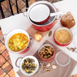 Kakovosten emajl na jeklu je higieničen, enostaven za čiščenje in v kombinaciji z belimi pikami kuhinji doda brezčasen videz.