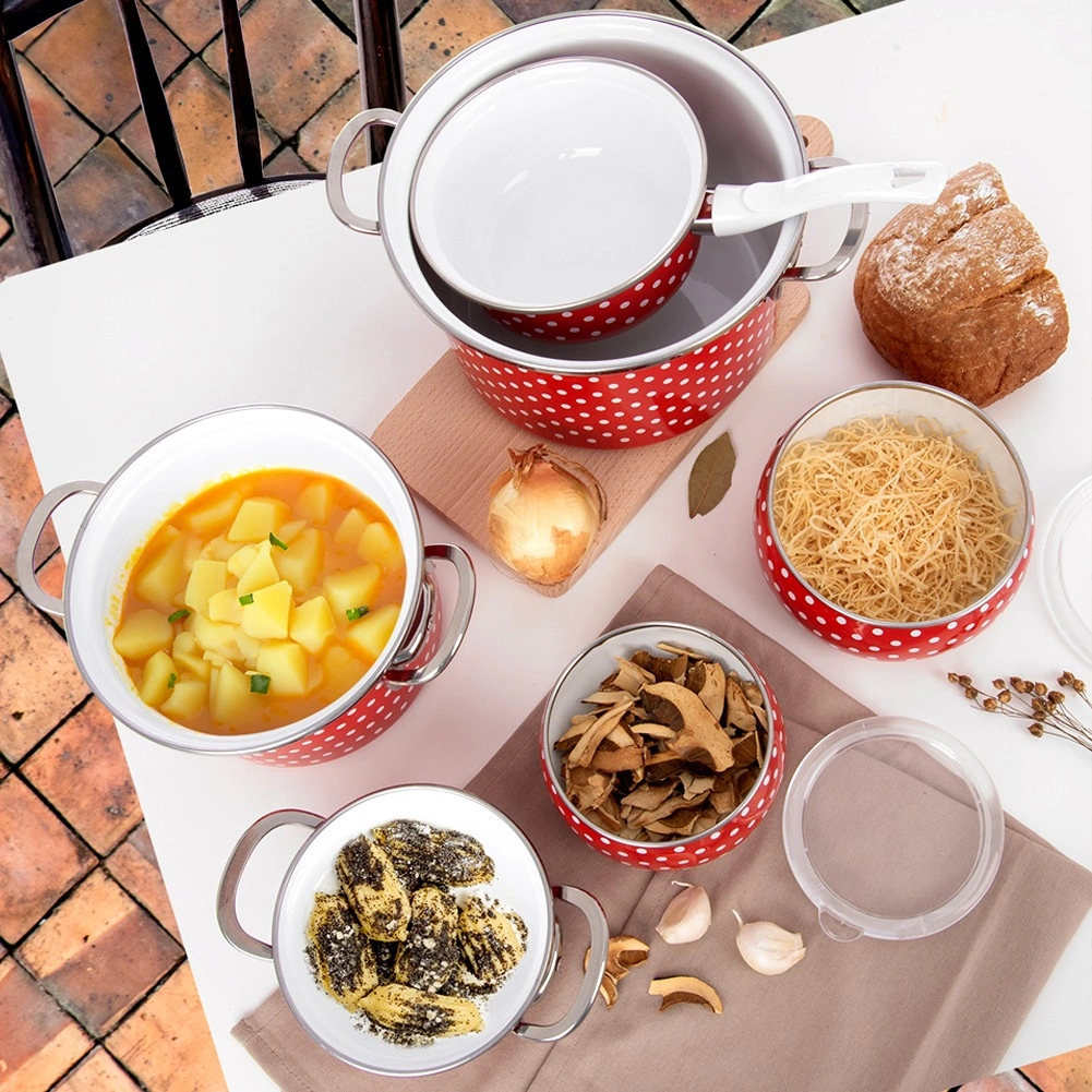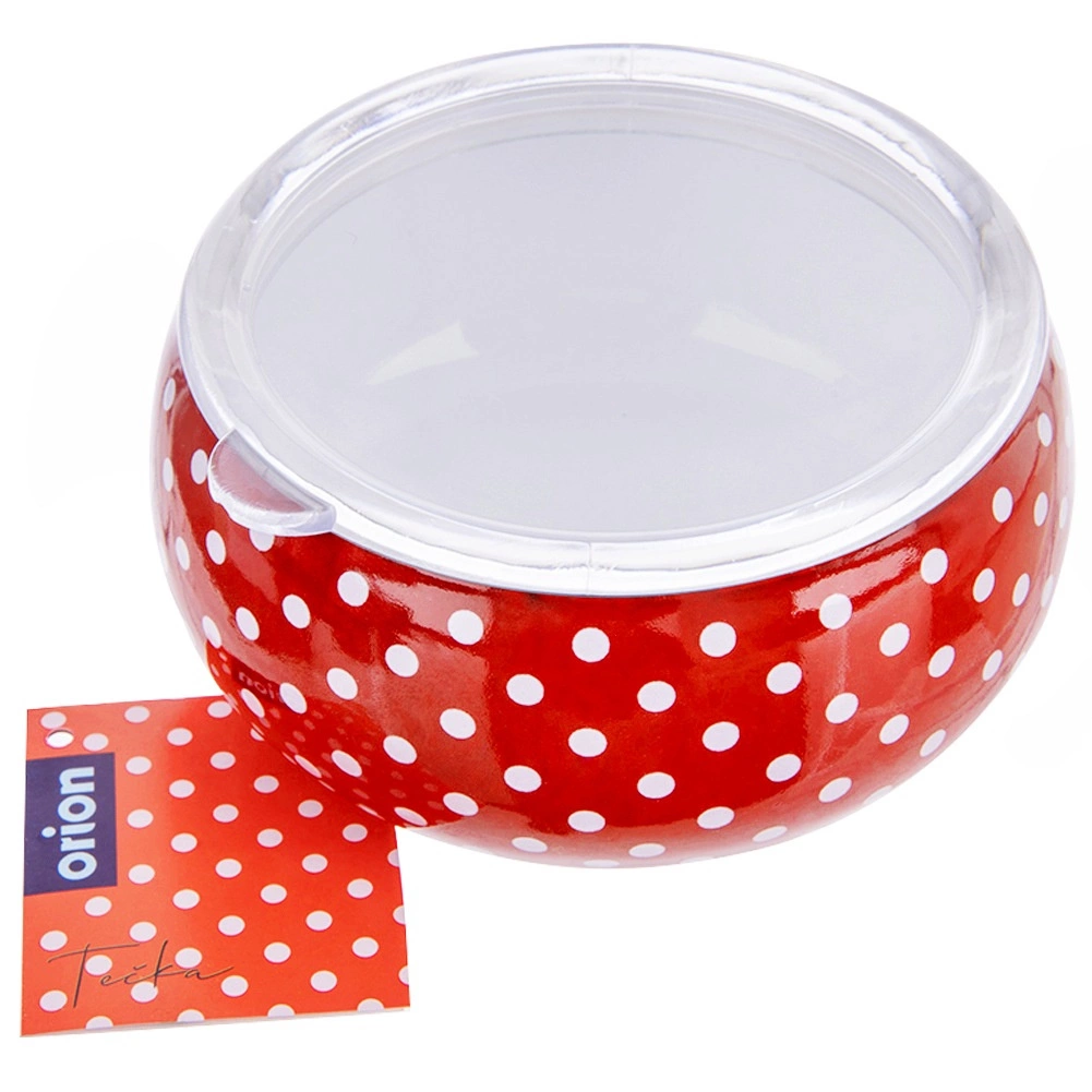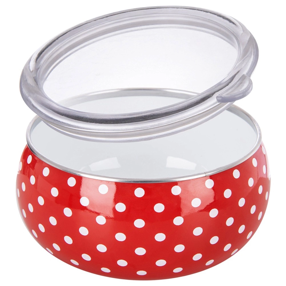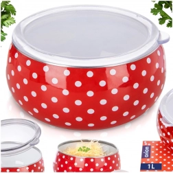 Okrogla skleda iz kolekcije Pikica navduši z retro dizajnom s pikami in praktičnim prosojnim pokrovom, ki omogoča takojšen vpogled v vsebino. Emajl je zdravstveno neoporečen in primeren tudi za alergike. Skleda ima mere 15,5 × 15,5 × 7,5 cm in prostornino 1 l – popolna za solate, priloge, juhe, sadje ali malice.