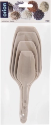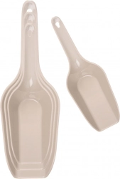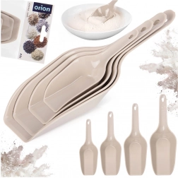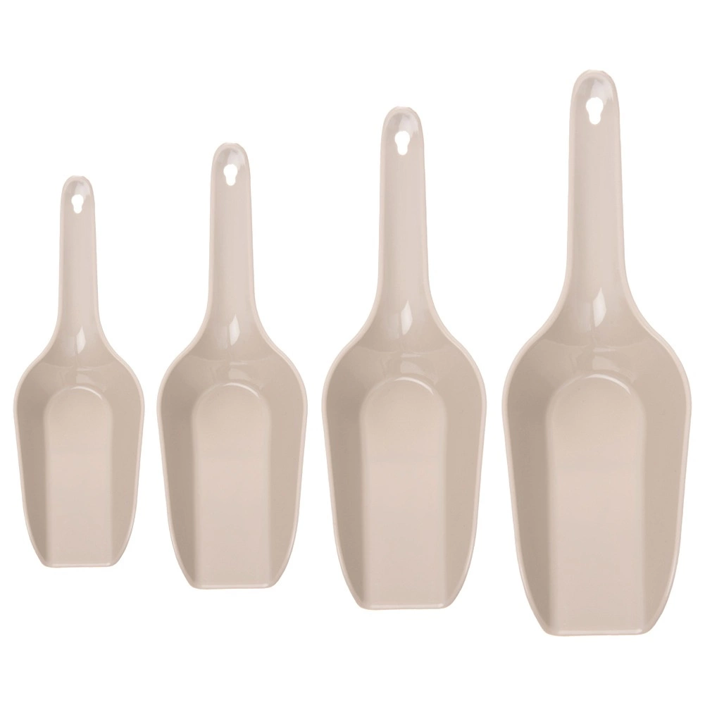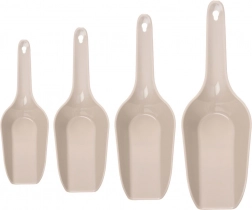 Praktičen set štirih zajemalk različnih velikosti za enostavno zajemanje in pretakanje razsutih živil doma in v gastronomiji. Trpežna plastična izvedba v bež barvi, udobni ročaji z odprtino za obešanje in možnost pomivanja v pomivalnem stroju. Vsestranska uporaba za moko, sladkor, kavo, kosmiče, zdrob, led ali hrano za hišne ljubljenčke. Gladka površina za enostavno čiščenje in prostorsko varčno zložljivo shranjevanje.