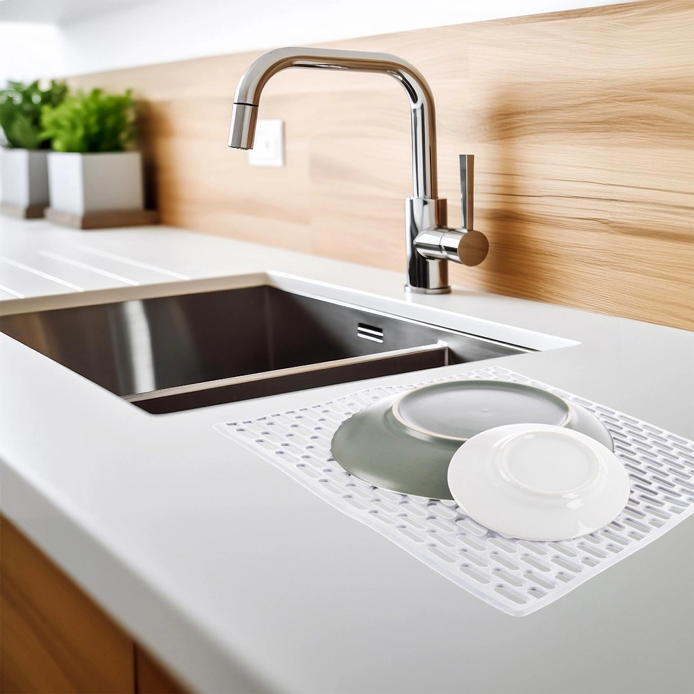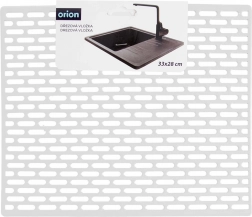 Univerzalna mera 33 × 28 cm in nevtralna bela barva se zlahka ujemata z večino kuhinjskih korit in slogov. Podloga je odporna na vodo, enostavna za čiščenje, njena protizdrsna struktura pa povečuje varnost pri pomivanju posode.
