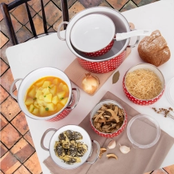 Univerzalno dno je združljivo s plinskimi, električnimi, steklokeramičnimi, halogenskimi in indukcijskimi kuhalnimi ploščami, lonec pa lahko uporabite tudi v pečici. Po kuhanju ga brez skrbi vstavite v pomivalni stroj. Naravne drobne nepravilnosti emajla (npr. rahle izbokline ali odstopanja v potisku) so značilen znak tradicionalne izdelave in ne vplivajo na kakovost ali funkcionalnost.