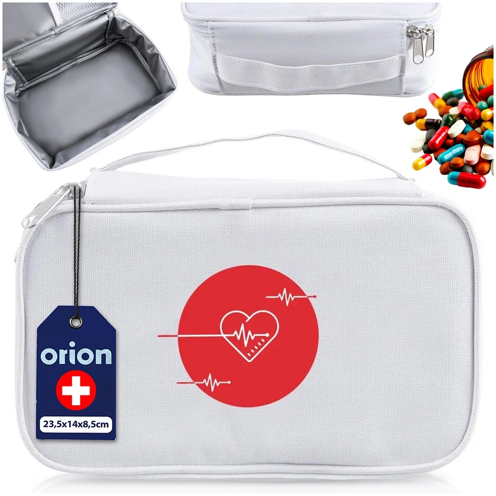 Varno in pregledno shranjujte zdravila, sirupe, injekcije ter manjše medicinske pripomočke. Termo torba ORION je izdelana iz trpežnega poliestra v beli barvi z rdečim motivom srca in EKG. Termoizolacijska obloga pomaga ohranjati stabilno temperaturo in ščiti vsebino pri kratkotrajnem prenašanju.