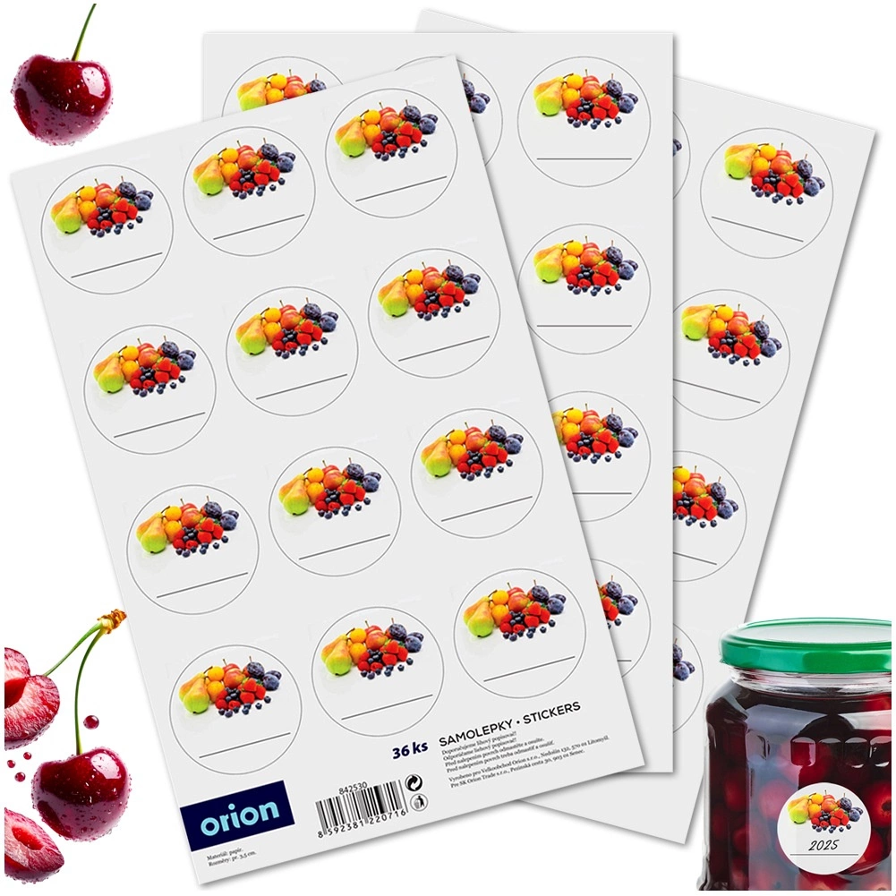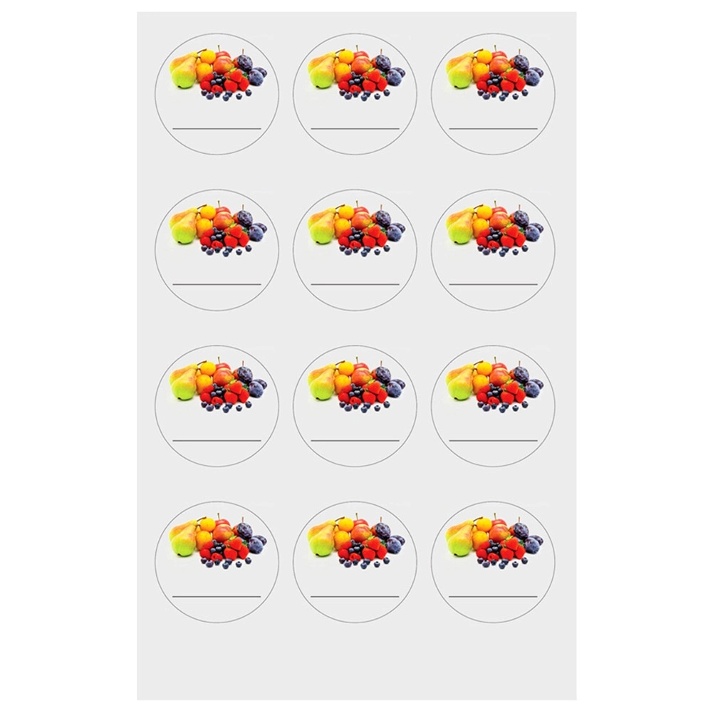 Ohranite red v shrambi in kuhinjskih omaricah s stilskimi etiketami s sadnim motivom. Okrogle nalepke s premerom 3,5 cm se zlahka prilepijo na kozarce, steklenice in začimbnice ter jih spremenijo v pregledno oznažene zaloge. Laminiran papir zagotavlja boljšo odpornost proti obrabi in daljšo življenjsko dobo.