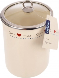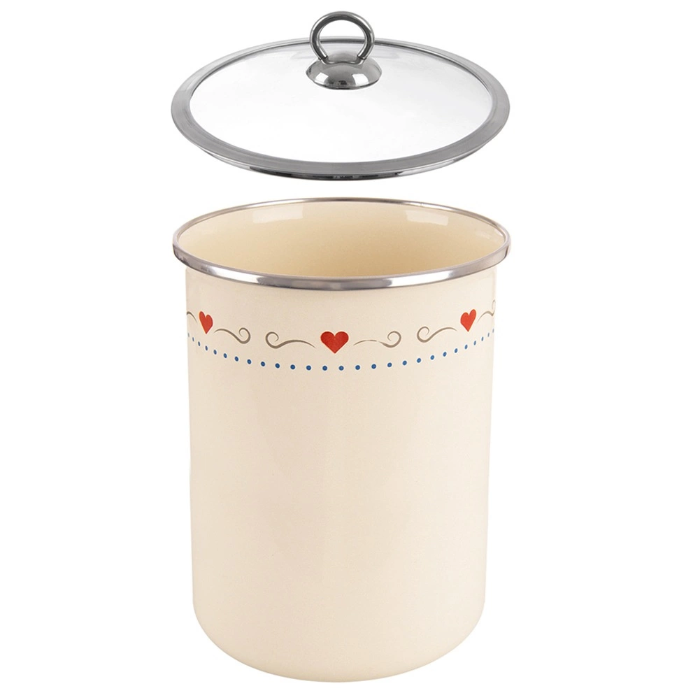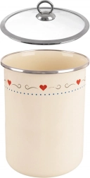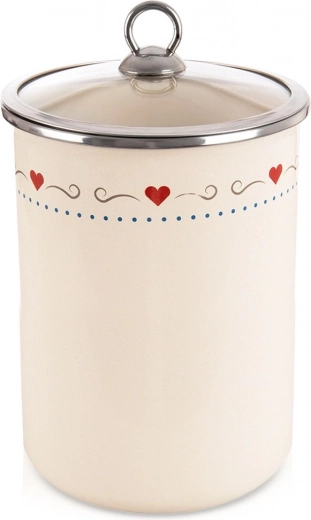 Praktična in dekorativna posoda serije TONCA je izdelana iz kakovostnega emajliranega jekla v krem odtenku z nežnim srčnim motivom. Steklen pokrov z nerjavečim robom zagotavlja dobro tesnjenje in hkrati omogoča takojšen pregled nad vsebino brez odpiranja.