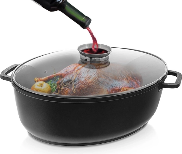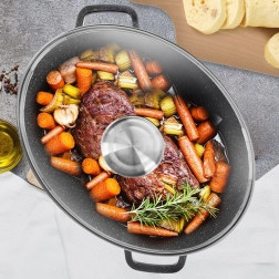 Robusten litoaluminijasti pekač z vrhunsko granitno površinsko obdelavo PFLUON GRANIT odlično akumulira toploto in ohranja jedi dlje tople. Steklena pokrovka omogoča nadzor priprave brez nepotrebnega odpiranja, vgrajeni dozator pa omogoča podlivanje z vodo ali vinom oziroma odmerjanje tekočih začimb neposredno med peko.
