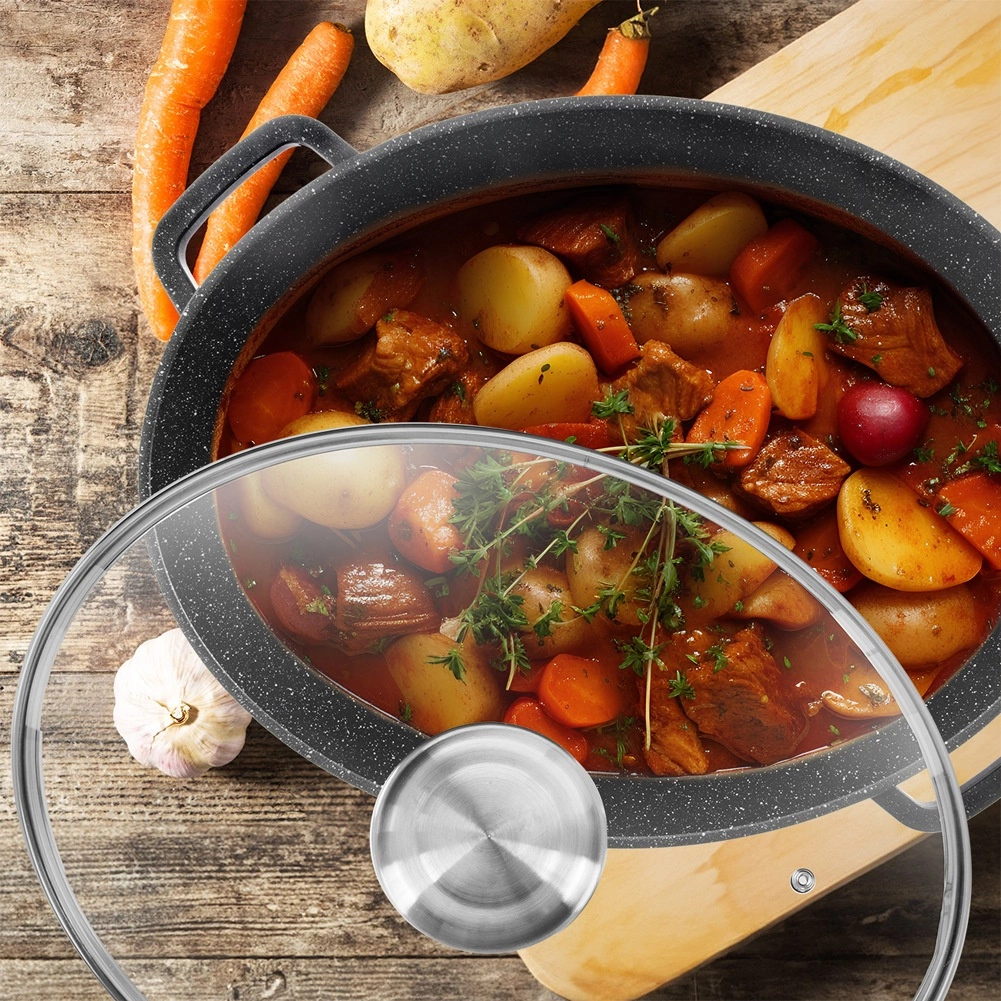 Zaradi prostornine 12 litrov boste brez težav pripravili večje porcije – od pečene gosi do obilnega govejega lonca. Pekač je primeren za pečico (ohišje do 230 °C, s stekleno pokrovko do 200 °C) in za vse vrste kuhalnih plošč, vključno z indukcijo. Po kuhanju ga preprosto operete v pomivalnem stroju.