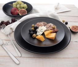 Minimalistična zasnova v mat črni barvi povzdigne vsakodnevno serviranje in slavnostno pogrnjeno mizo ter se zlahka kombinira z drugo keramiko.