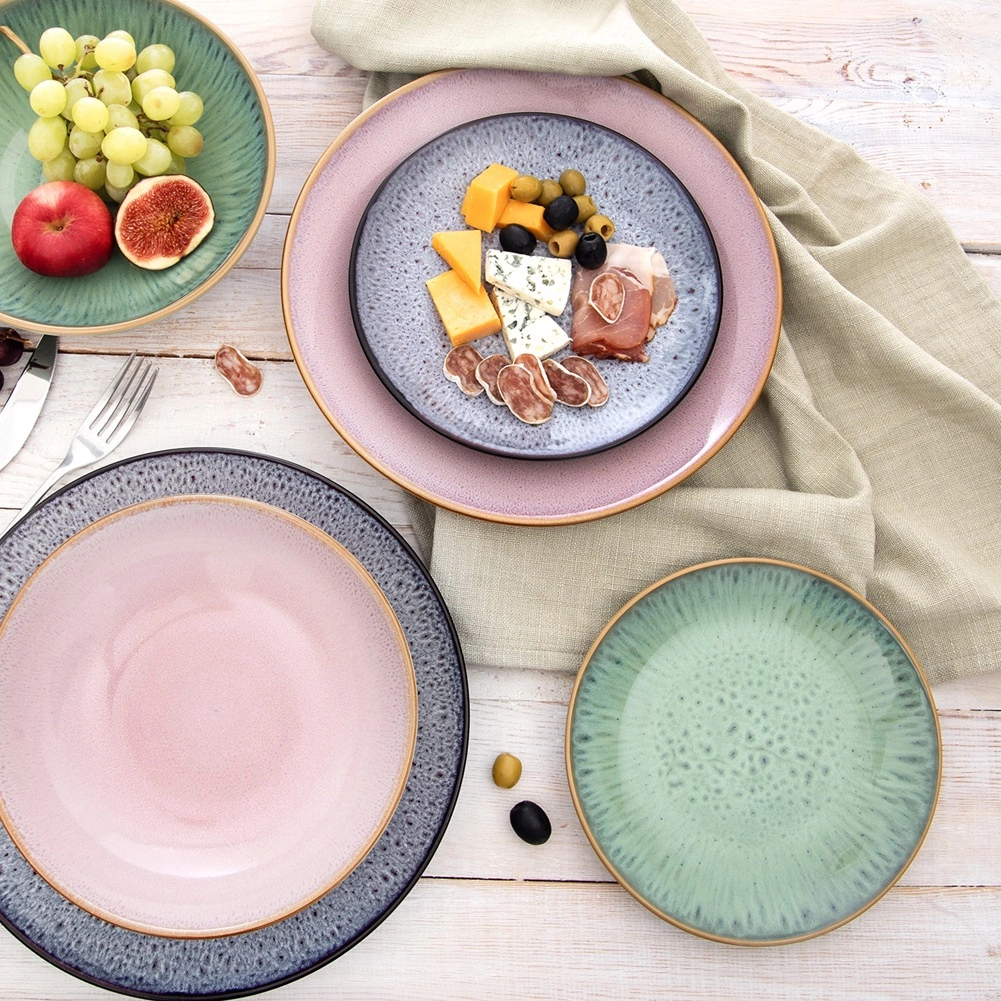 Stilski keramični desertni krožnik 20,5 cm iz kolekcije Glaze doda vašemu pogrinjku sodoben pridih. Zelena glazura z nežnim, učinkovitim posipom in kontrastnim robom deluje elegantno in se zlahka kombinira z ostalimi kosi posode.