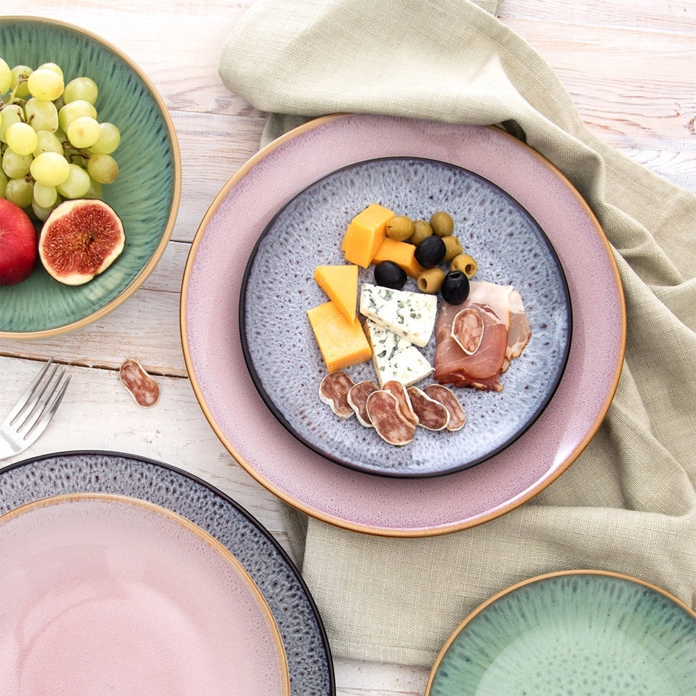 Reaktivna, nežno pikčasta glazura krožniku daje izviren videz, zato vsak kos na pogrnjeni mizi deluje edinstveno.