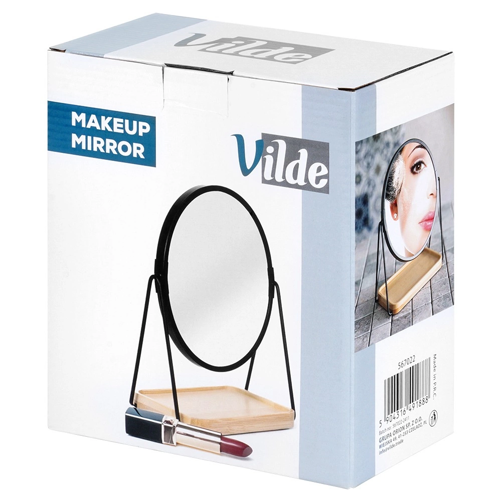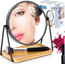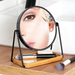 Obojestransko kozmetično ogledalo s premerom zrcalne površine 15 cm je idealno za vsakodnevno ličenje, urejanje obrvi in natančno nego. Stabilno kovinsko stojalo v črni barvi dopolnjuje naravni bambusov podstavek, ki hkrati služi kot praktična odlagalna polička za čopiče, kozmetične pripomočke ali nakit. Minimalističen dizajn v kombinaciji bele barve in lesa se zlahka poda sodobnim interierjem.