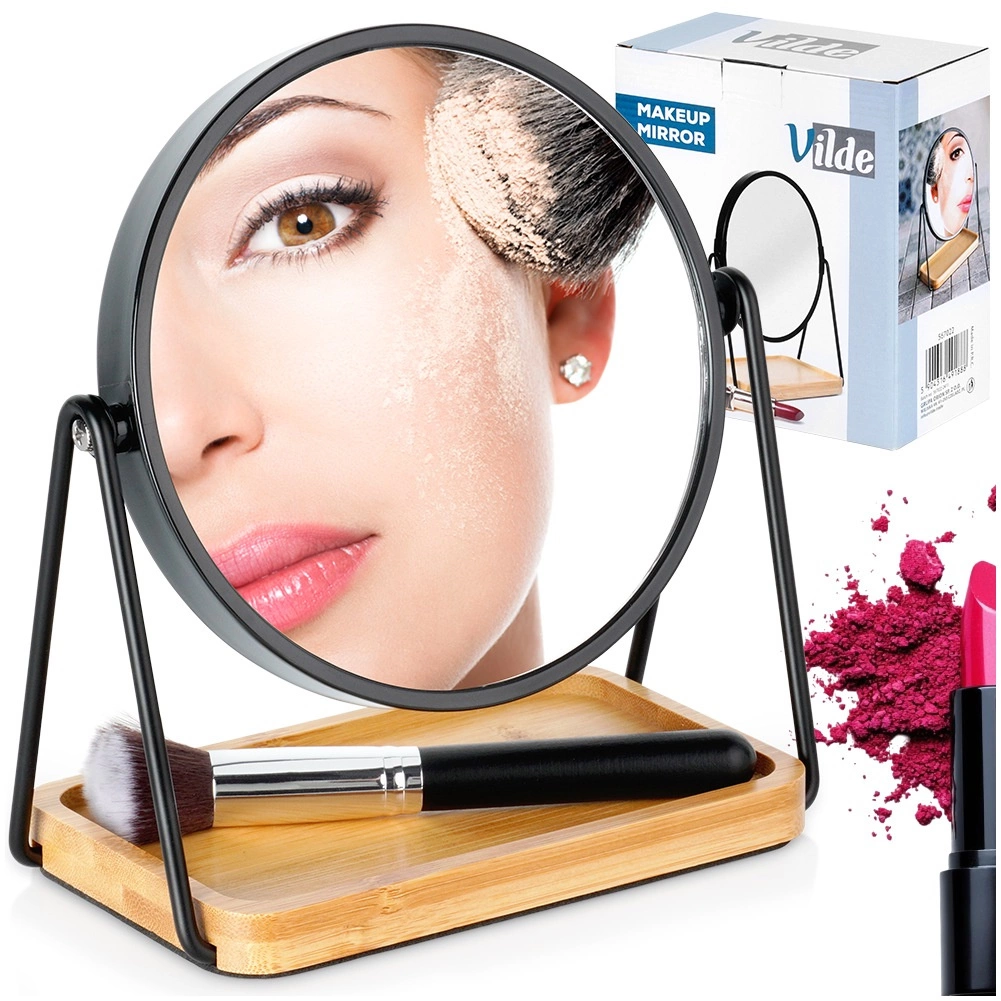 Zahvaljujoč dvema stranema ogledala dobite klasičen odsev in povečevalni učinek za maksimalno natančnost. Vrtljiv mehanizem omogoča hitro preklapljanje med stranema po potrebi. Kompaktne dimenzije 18,5 × 10,5 × 20 cm zagotavljajo, da ogledalo ne zavzame veliko prostora na toaletni mizici ali na umivalniški površini.