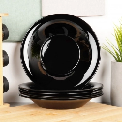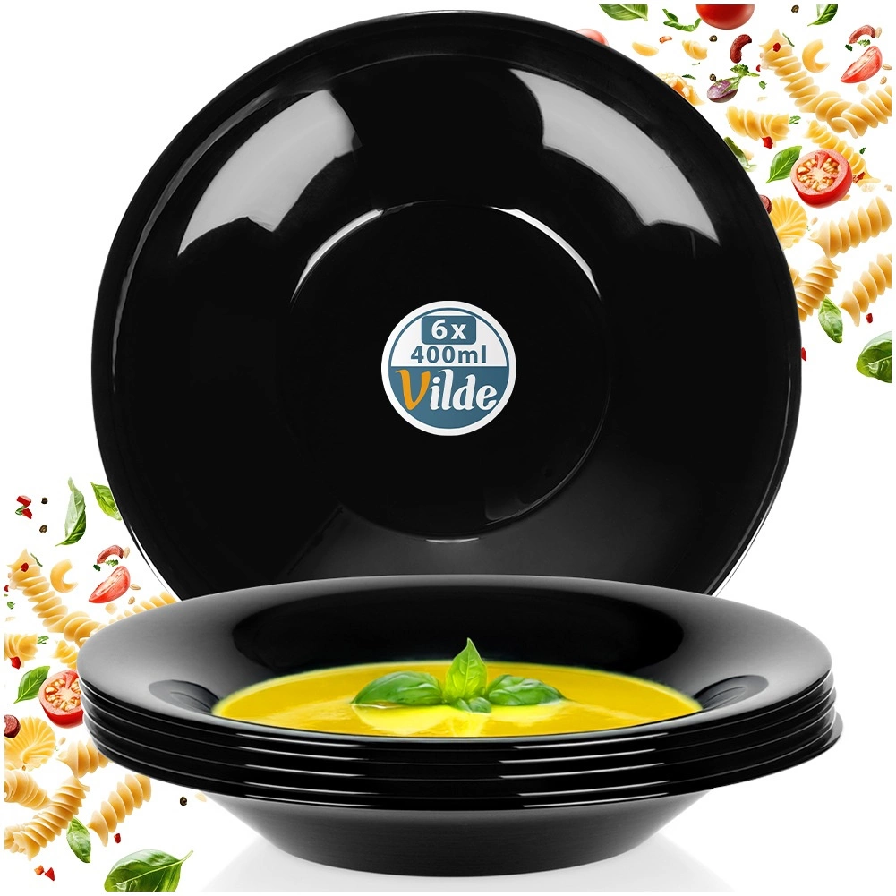 Set globokih krožnikov iz opalnega stekla v brezčasni črni barvi bo vašemu stolu dodal šarm in eleganco. S premerom 21,5 cm in prostornino 400 ml so krožniki popolni za serviranje juh, krem, testenin in solat. Odporen material spominja na porcelan, hkrati pa je praktičen za vsakodnevno uporabo.