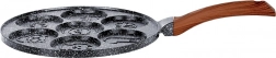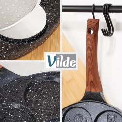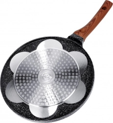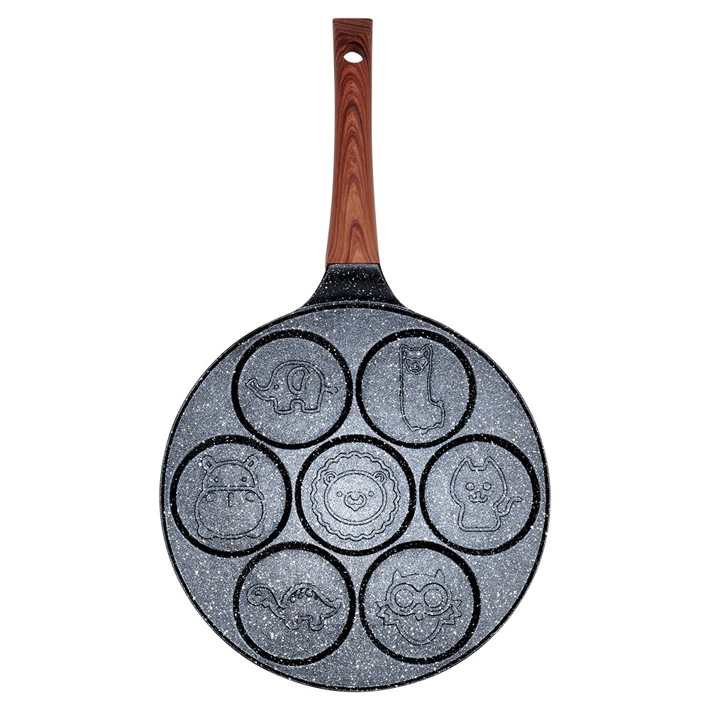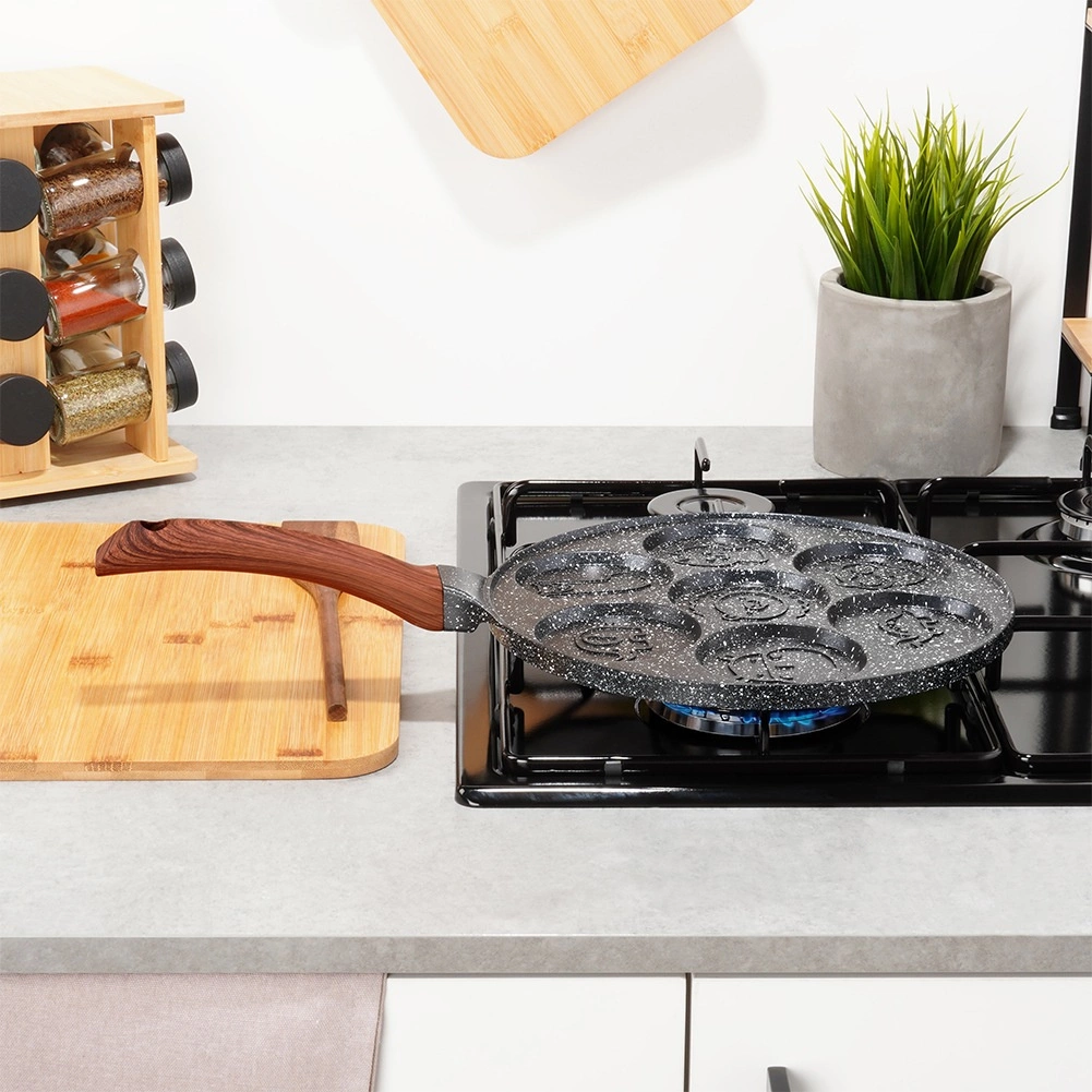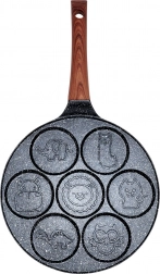 Ta elegantna ponev iz linije BLACK & WOOD je idealna za jajca, palačinke in mini palačinke. Sedem okroglih vdolbin z igrivimi reliefi živalic ustvari lepe, enotne oblike in vnese veselje v vsak zajtrkovalni ritual. Odporna aluminijasta konstrukcija z granitno obdelavo zagotavlja hitro segrevanje in dolgo življenjsko dobo.