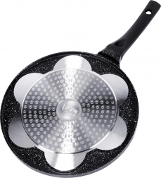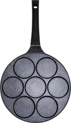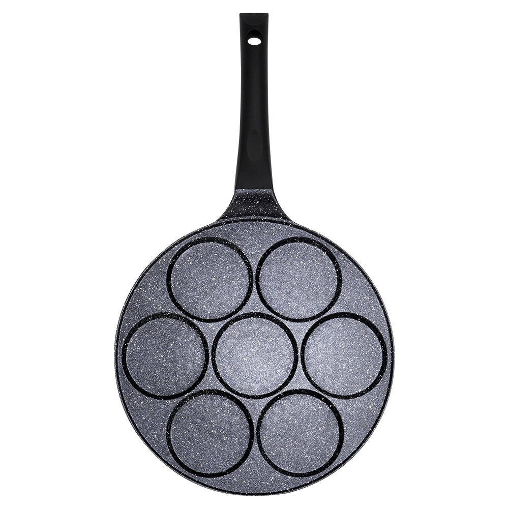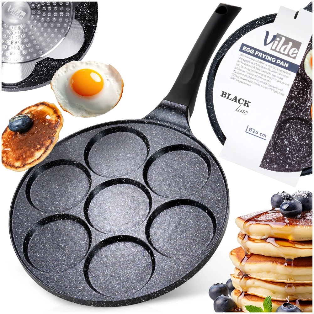 Odkrijte elegantno ponev iz linije BLACK LINE, ki zagotovi popolnoma enake porcije in lepo okroglo obliko vašega zajtrka. Zahvaljujoč 7 oblikam hkrati pripravite jajca, krompirjeve polpete ali livance za vso družino. Odporen aluminij z neprijemljivo granitno površino zmanjšuje prismoditve in olajša čiščenje, medtem ko hiter in enakomeren prenos toplote skrajša čas kuhanja.