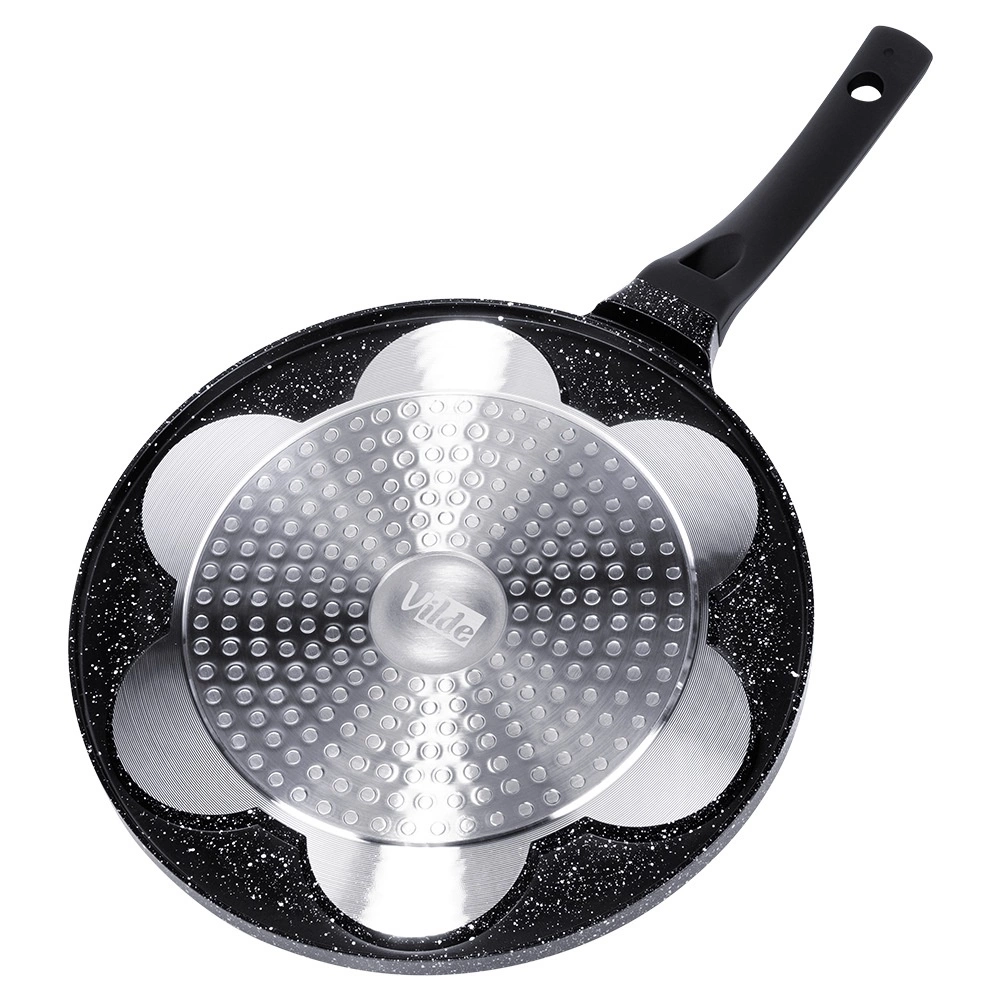 Večplastno dno učinkovito vodi toploto po celotni površini ponve, skrajša čas priprave in zagotavlja enakomerno zapečenost.