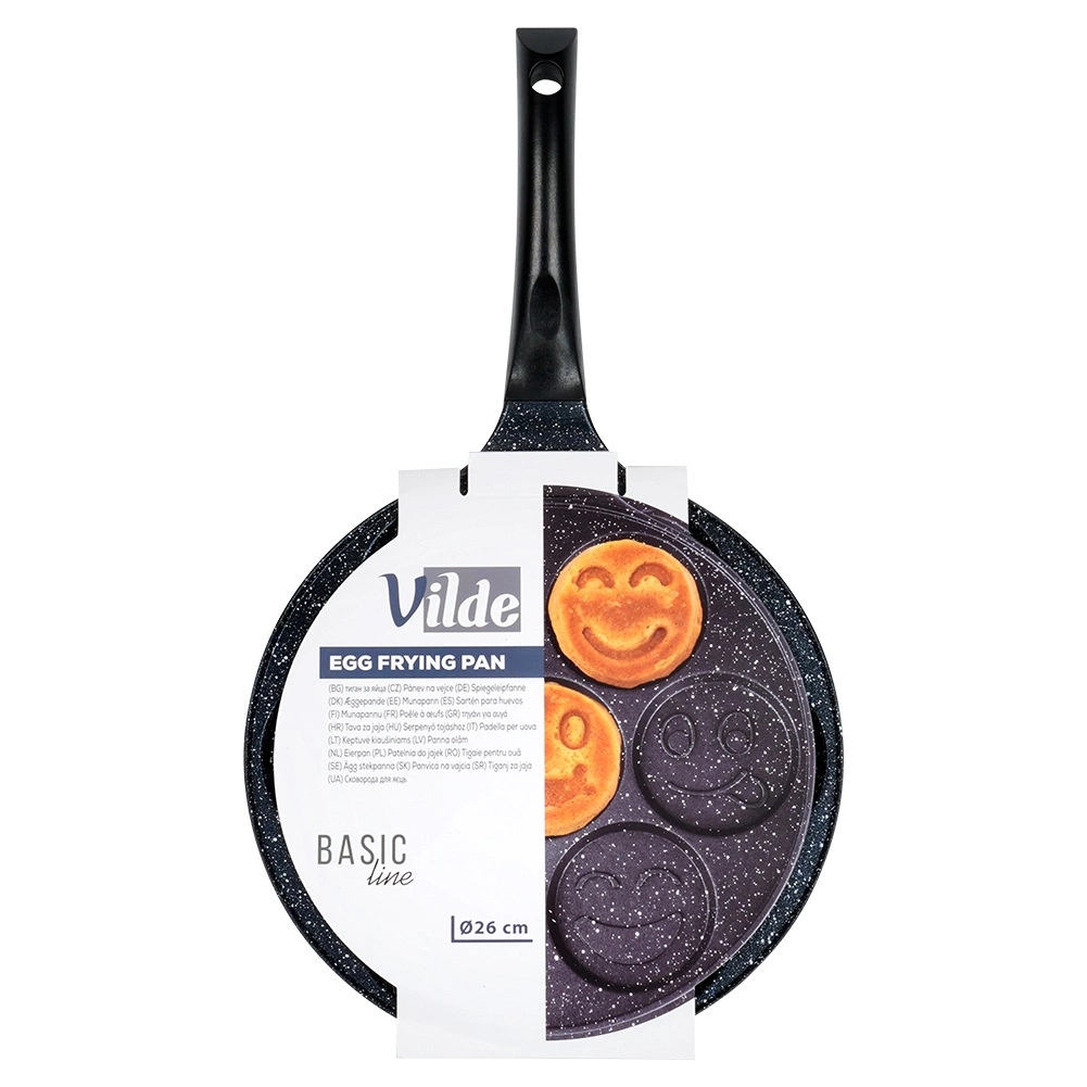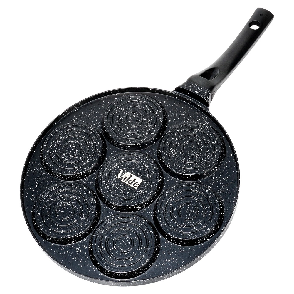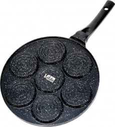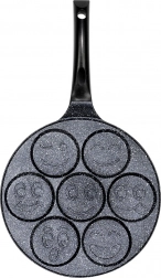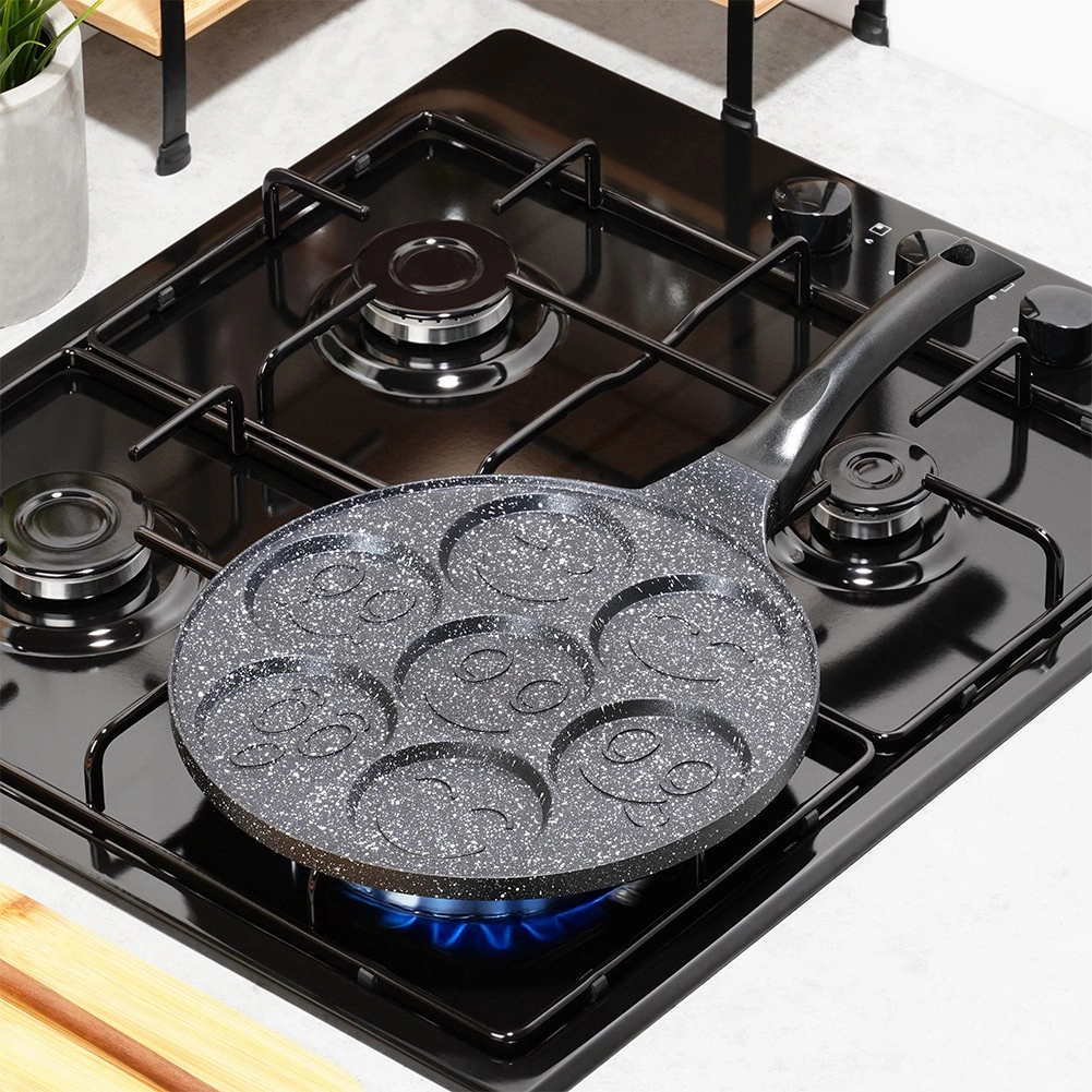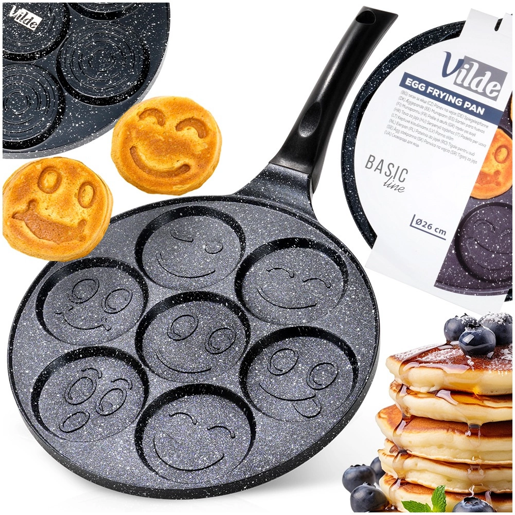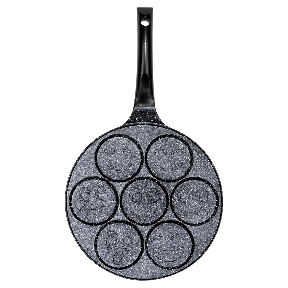 Pripravite popoln zajtrk za vso družino: 7 okroglih odprtin z veselimi “smiley” motivi ustvari enakomerne porcije palačink, mini palačink ali ocvrtih jajc. Neprijemljivi granitni sloj zagotavlja preprosto obračanje in serviranje ter zmanjšuje potrebo po olju.