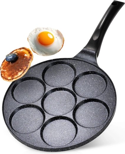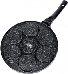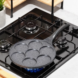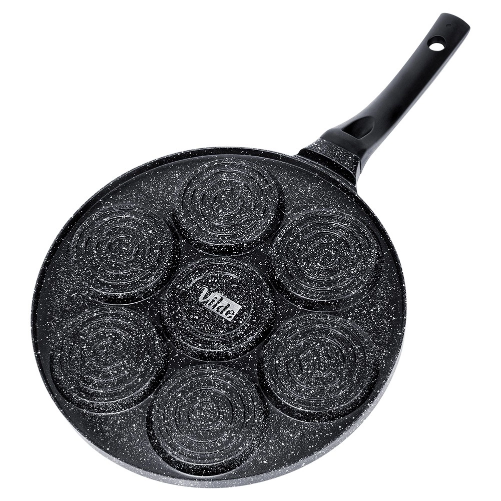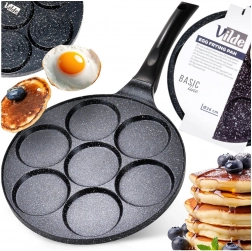Uživajte v hitrih in enostavnih zajtrkih s ponevjo, ki ohranja porcije v popolni obliki. Sedem ločenih vdolbin premera 8 cm zagotavlja enakomerno zapečenost in lepo okrogle porcije – od jajc na oko do puhaste pancakes. Zahvaljujoč granitni nelepljivi površinski obdelavi se jedi ne prijemajo in za pripravo zadostuje minimum olja.