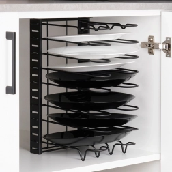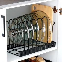 Ohranjajte pokrovke, krožnike in deske ločene in pregledne. Organizator prihrani prostor in pospeši dostop do pogosto uporabljene posode.