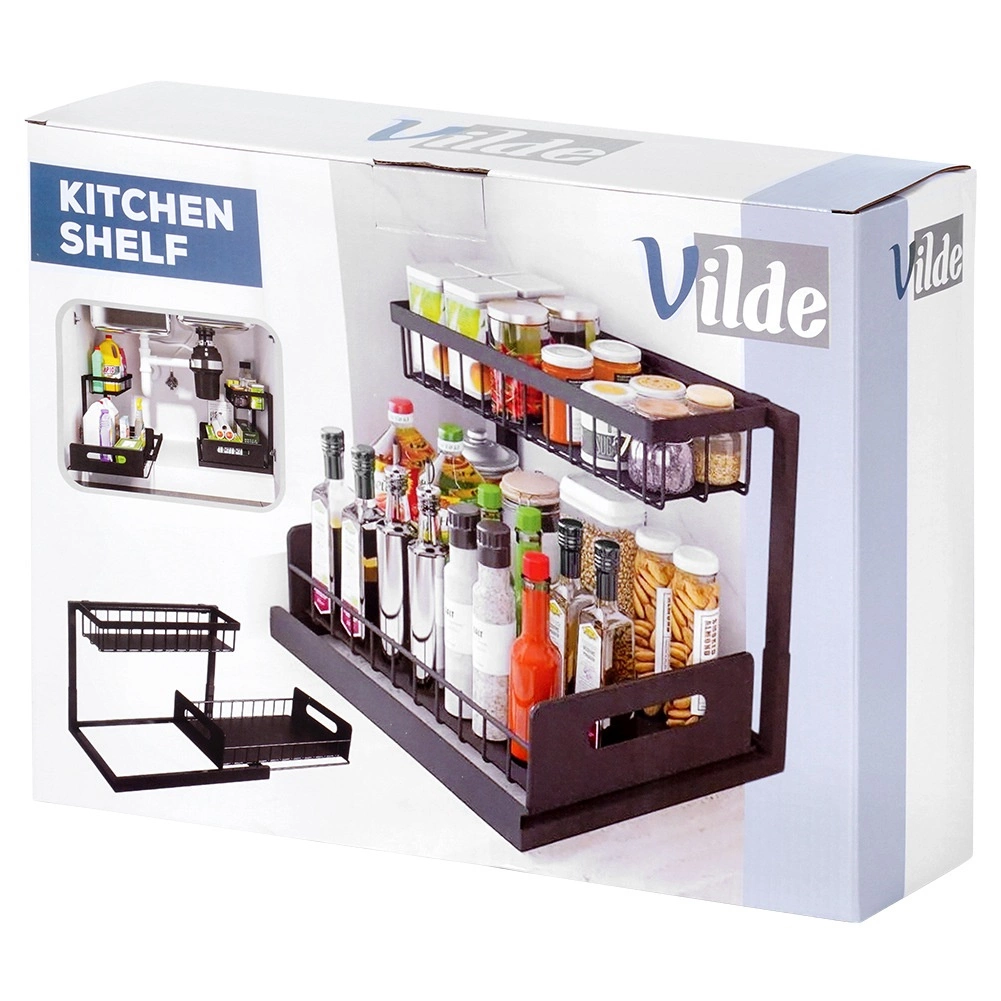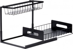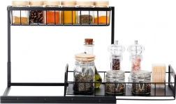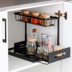 Ta dvonadstropna polica z merami 36 × 27 × 28,5 cm ponuja pametno organizacijo začimb, dodatkov za začinjanje in manjših kozarcev. Spodnji koš je izvlečen, zato imate nad vsem takojšen pregled in enostaven doseg. Razmik med policami 21 cm omogoča shranjevanje tudi višjih mlinčkov ali steklenic.