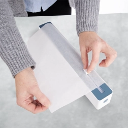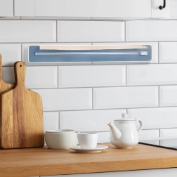 Dozirnik obvlada živilsko folijo, aluminijasto folijo in peki papir. S priloženimi priseski in obojestranskim trakom 3M ga pritrdite na gladke površine brez vrtanja ali ga preprosto pospravite v predal. Menjava role je stvar sekund – pritisnete stranske zaponke, vstavite rolo na nosilce in lahko režete.