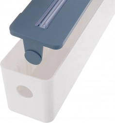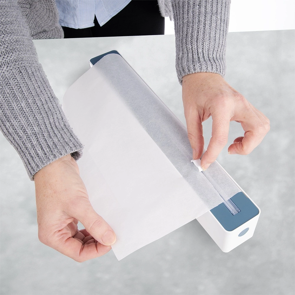 Ohranite kuhinjo brezhibno urejeno z elegantnim dozirnikom, ki združuje hitro odmerjanje, čist rez brez cefranja in udobno shranjevanje rolic. Integrirana letvica z ostrim rezilom reže gladko in naravnost, medtem ko notranji omejevalniki preprečujejo pomik role.