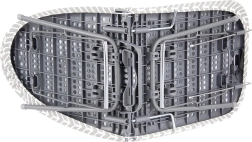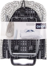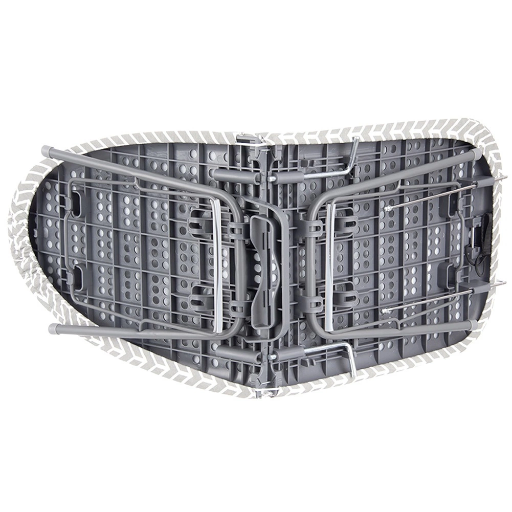 Kovinski okvir v sivi barvi, nedrseče nogice in varovalo proti samodejnemu zlaganju zagotavljajo varno in udobno likanje na katerikoli mizi.