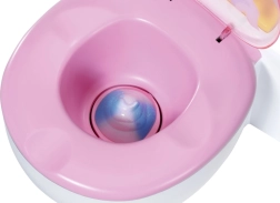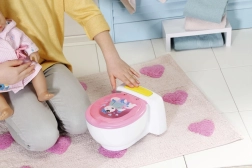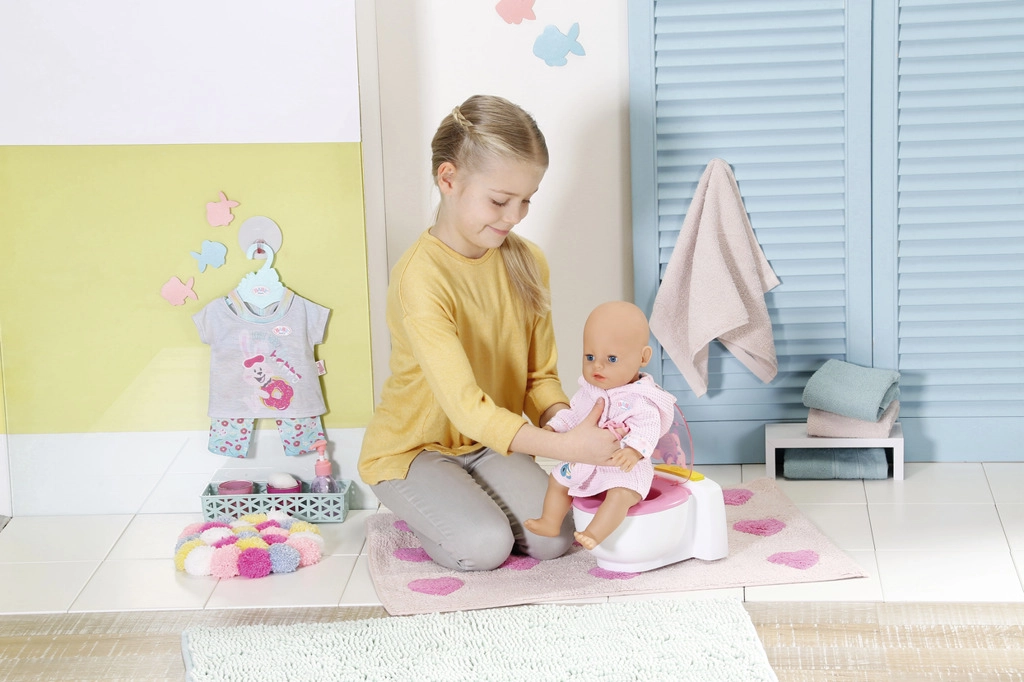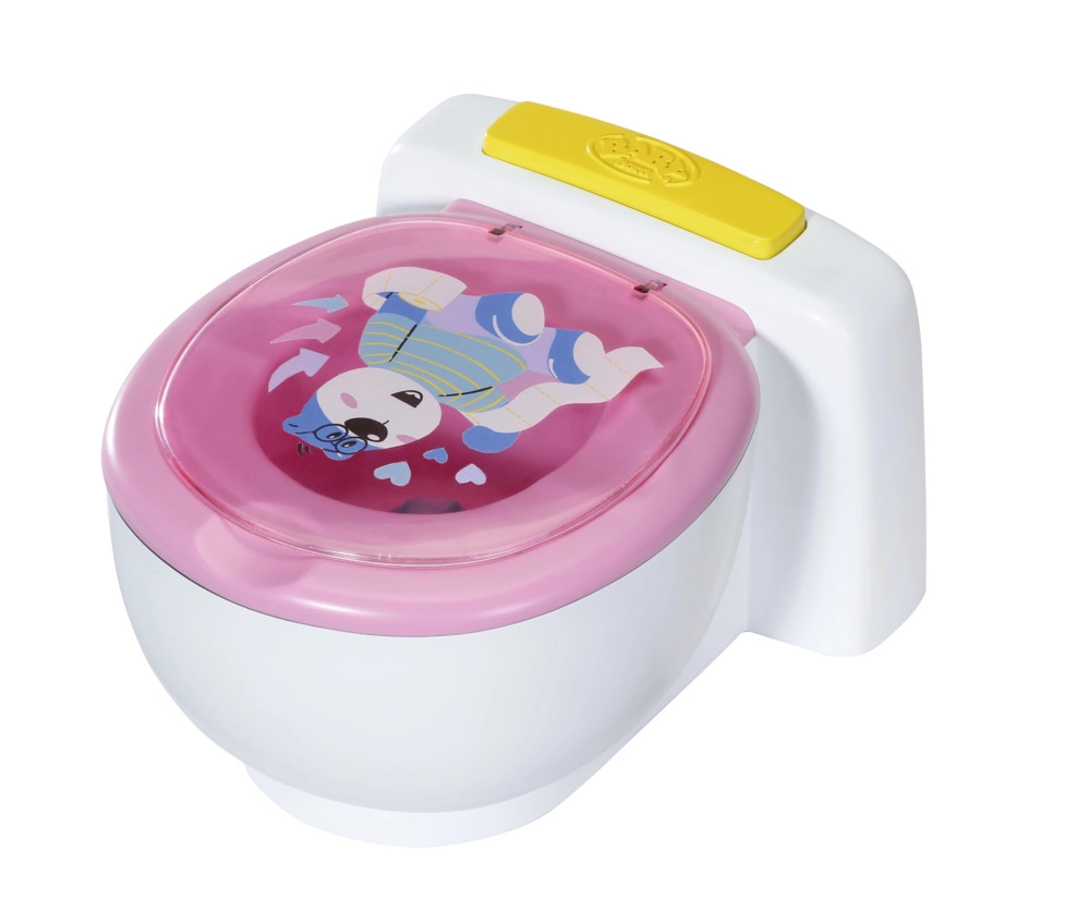 BABY born že hodi na stranišče! Ko se usede na svoj beli prestol z rožnatim sedalom, boš slišal zvoke lulanja, aplavza in veselega smeha. BABY born pa zna tudi kakati. V tem primeru se v školjki pojavi pisano bleščeče kakce. Hitro, čas je za splakovanje! Ko pritisneš gumb za splakovanje, kakec izgine in zaslišiš zvoke splakovanja.
